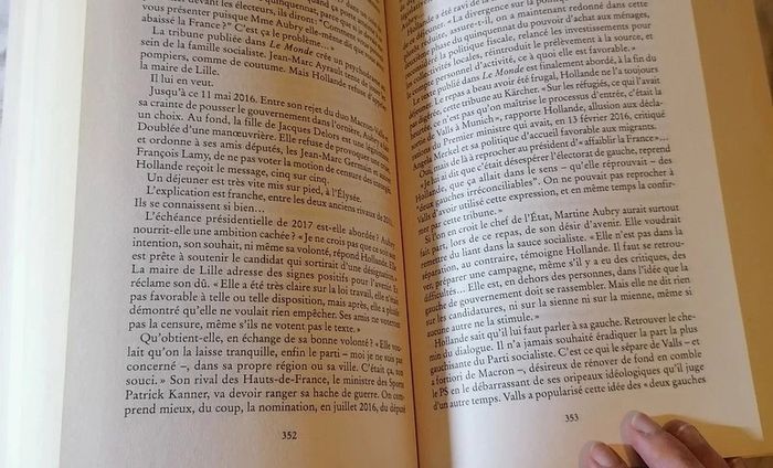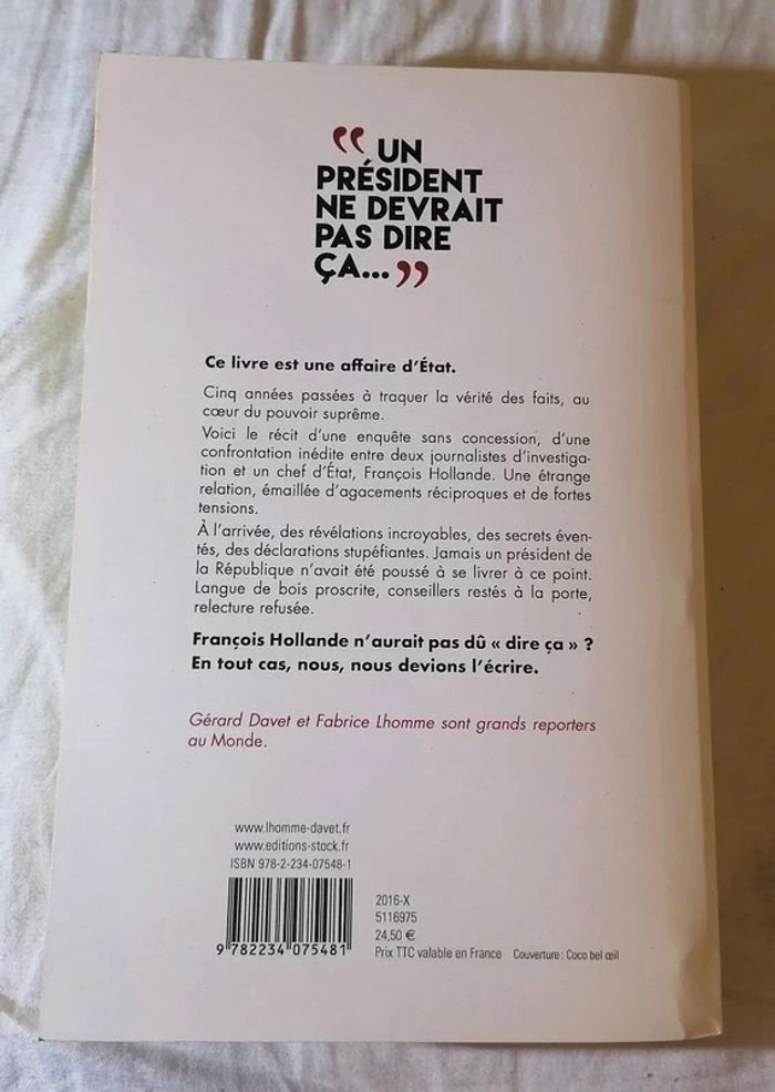 Résumé Ce livre est une affaire d’État. Cinq années passées à traquer la vérité des faits, au coeur du pouvoir suprême. Voici le récit d’une enquête sans concession, d’une confrontation inédite entre deux journalistes d’investigation et un chef d’État, François Hollande. Une étrange relation, émaillée d’agacements réciproques et de fortes tensions. À l’arrivée, des révélations incroyables, des secrets éventés, des déclarations stupéfiantes. Jamais un président de la République n’avait été poussé à se livrer à ce point. Langue de bois proscrite, conseillers restés à la porte, relecture refusée. 672 pages Format 16x24 Poids 0.776kg Prix d'achat : 24,50€ 🌟 Bon état, complet mais les 2 dernières pages se détachent. Ca ne gêne en rien la lecture du livre 🌟