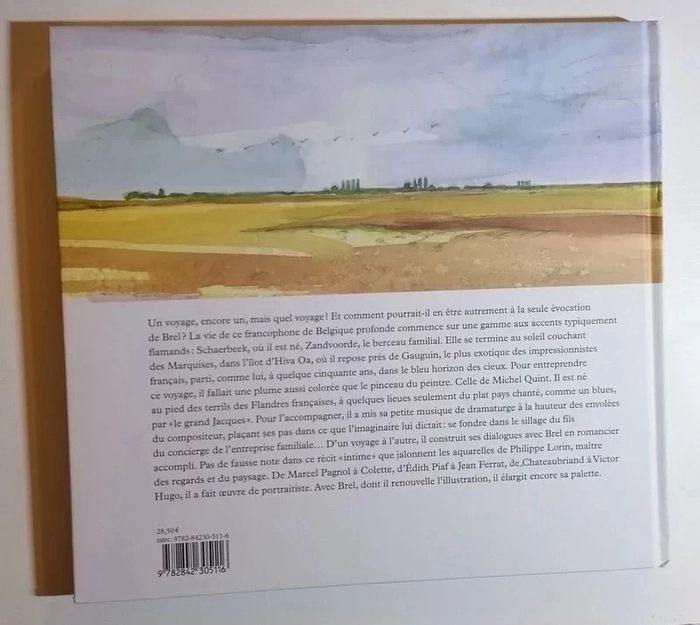 Un voyage, encore un, mais quel voyage ! Et comment pourrait-il en être autrement à la seule évocation de Brel ? La vie de ce francophone de Belgique profonde commence sur une gamme aux accents typiquement flamands : Schaerbeek, où il est né, Zandvoorde, le berceau familial. Elle se termine au soleil couchant des Marquises, dans l'îlot d'Hiva Oa, où il repose près de Gauguin, le plus exotique des impressionnistes français. Pour entreprendre ce voyage, il fallait une plume aussi colorée que le pinceau du peintre. Celle de Michel Quint. Il est né au pied des terrils des Flandres françaises, à quelques lieues seulement du plat pays chanté par «le grand Jacques». Pour l'accompagner, il a mis sa petite musique de dramaturge à la hauteur des envolées du compositeur, plaçant ses pas dans ce que l'imaginaire lui dictait : se fondre dans le sillage du fils du concierge de l'entreprise familiale¿ D'un voyage à l'autre, il construit ses dialogues avec Brel en romancier accompli. Michel Quint et Philippe Lorin Éditions : Hoëbeke Poids : 1.1kg Pages : 126 Dimensions : 28 x 30 x1,7 cm 🌟 Neuf sans blister, léger plis sur la tranche 🌟 #livre #livredart #livredessin #peintre #culture #nomade #peinture #noel #cadeau #voyage #brel #jacquesbrel #biographie #bizs33loisirs #bizs33livre #vintedgift