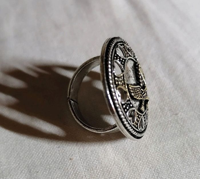 ❤️ Jolie bague forme ronde couleur argenté et doré. ❤️ Motifs cœurs filigranés et aigle au centre. Anneau ouvert, il est donc possible de l'ajuster à votre doigt. 🌟 Neuve, portée juste pour la photo 🌟 Taille plateau : 2.8 cm Tour de doigt ~ 60mm, diamètre ~22mm taille 60 Matière : métal argenté et doré #bague #bizs33 #bizs33accessoires #vintage #styleretro #stylevintage #cowboy #retro #amerique #indien #bizs33bague #bizs33bijoux #bizs33bijoux #bagueargent #baguedore #or #argent #vintage #aigle #filigrane #coeur #amour #noel #cadeau