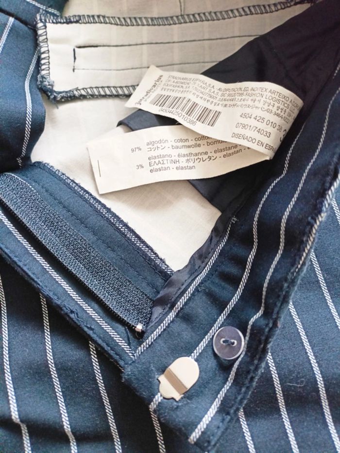 Pantalon rayé bleu et blanc 2 poches devant et 2 derrière Bouton, crochet et fermeture éclair 97% de coton Stradivarius Très bon état #sarrado #sarradofemme #sarradofemme38 #domloup #rennes #chateaugiron