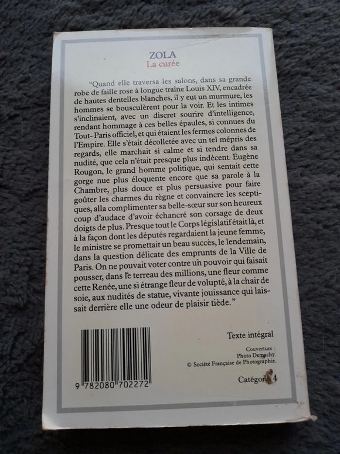 La curée- Zola GF- Flammarion Très bon état en dehors des côtes de pages qui sont un peu sales. "Quand elle traversa les salons, dans sa grande robe de faille rose à longue traine Louis XIV, encadrée de hautes dentelles blanches, il y eut un murmure, les hommes se bousculèrent pour la voir Et les intimes s'inclinaient, avec un discret sourire d'intelligence, rendant hommage à ces belles épaules, si connucs du Tout- Pans officiel, et qui étaient les fermes colonnes de l'Empire. Elle s'était décolletée avec un tel mépris des. regards, elle marchait si calme et si tendre dans sa nudité, que cela n'était presque plus indécent, Eugène Rougon, le grand homme politique, qui sentait cette gorge nue plus éloquente encore que sa parole à la Chambre, plus douce et plus persuasive pour faire gouter les charmes du règne et convaincre les scepti- ques, alla complimenter sa belle-sceur sur son heureux coup d'audace d'avoir échancré son corsage de deux doigts de plus. Presque tout le Corps législatifétait là, et à la façon dont les députés regardaient la jeune femme, le ministre se promettait un beau succès, le lendemain, dans la question délicate des emprunts de la Ville de Paris. On ne pouvait voter contre un pouvoir qui faisait pousser, dans Te terreau des millions, une fleur comme cette Renée, une si étrange fleurde volupté, à la chair de soie, aux nudités de statue, vivante jouissance qui lais- sait derrière clle une odeur de plaisir tiède." Lot et Réduction possible :)