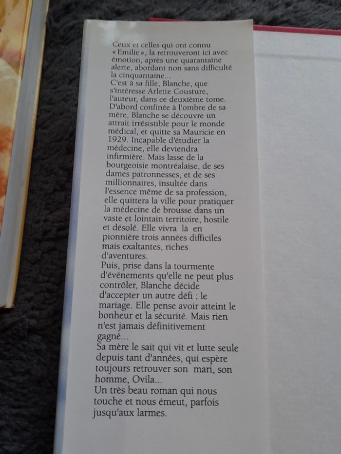 Ceux et celles qui ont connu «Emilie , la retrouveront ici avec emotion, après une quarantaine alerte, abordant non sans difficulte Cest à sa fille, Blanche, que sintéresse Arlette Cousture, l'auteur, dans ce deuxième tome. D'abord confinte a l'ombre de sa mère, Blanche se découvre un attrait irrésistible pour le monde médical, et quitte sa Mauricie en 1929. Incapable d'étudier la médecine, elle deviendra infirmière. Mais lasse de la bourgeoisie montrealaise, Elle vivra la en pionnière trois années difficiles mais exaltantes, riches d'aventures. Puis, prise dans la tourmente d'evenements qu'elle ne peut plus contrôler, Blanche decide d'accepter un autre défi : le mariage. Elle pense avoir atteint le bonheur et la sécurité... Un très beau roman qui nous Touche et nous émeut, parfois squ'aux larmes.