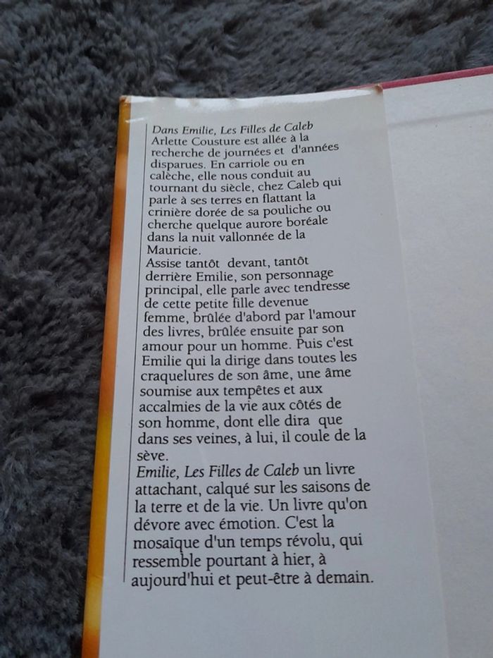 Dans Émilie, Les Filles de Caleb Arlette Cousture est allée a la recherche de journées et d'années disparues, En carriole ou en calèche, elle nous conduit au tourmant du siecle, chez Caleb qui parle a ses terres en flattant la crinière doree de sa pouliche ou cherche quelque aurore boréale dans la nuit vallonne de la Mauricie. Assise tantot devant, tantot derrière Emilie, son personnage principal, elle parle avec tendresse de cette petite fille devenue femme, brülée d'abord des livres, brulee ensuite par son amour pour un homme. Puis c'est Emilie qui la dirige dans toutes les craquelures de son Ame, une ame soumise aux tempetes et aux accalmies de la vie aux côtés de son homme, dont elle dira que dans ses veines, à lui, il coule de la sève. Emilie, Les Filles de Caleb un livre attachant, calqué sur les saisons de la terre et de la vie. Un livre qu'on dévore avec émotion. Cest la mosalque d'un temps révolu, qui ressemble pourtant à hier, a aufourd hul et peut-etre A demain.