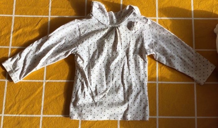 Haut blanc à pois dorés en très bon état. Taille 9 mois.