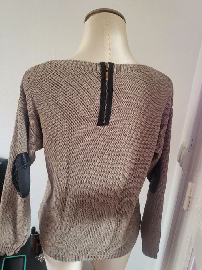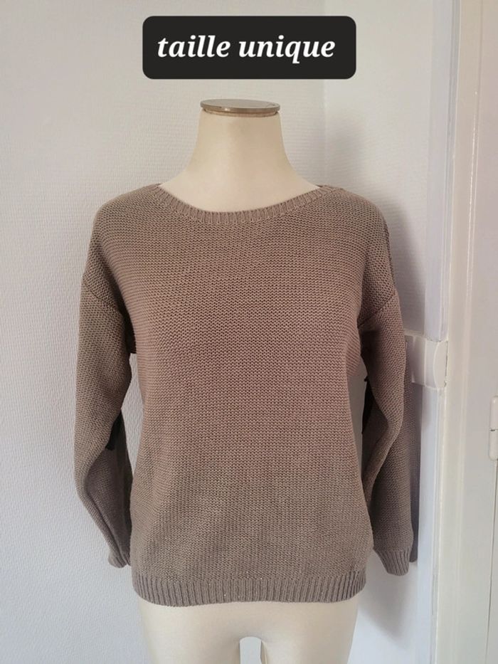 Pull taille unique, bien porté avec petit accro et simili cuir au coude qui s'enlève voir dernières photos. #aurore78990femmetailleunique #aurore78990femme34 #aurore78990femme36 #aurore78990femme38