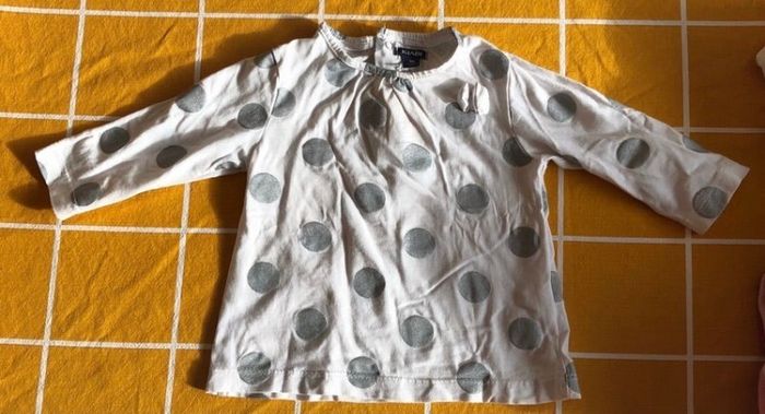 Haut blanc à gros pois argentés en très bon état. Taille 9 mois.