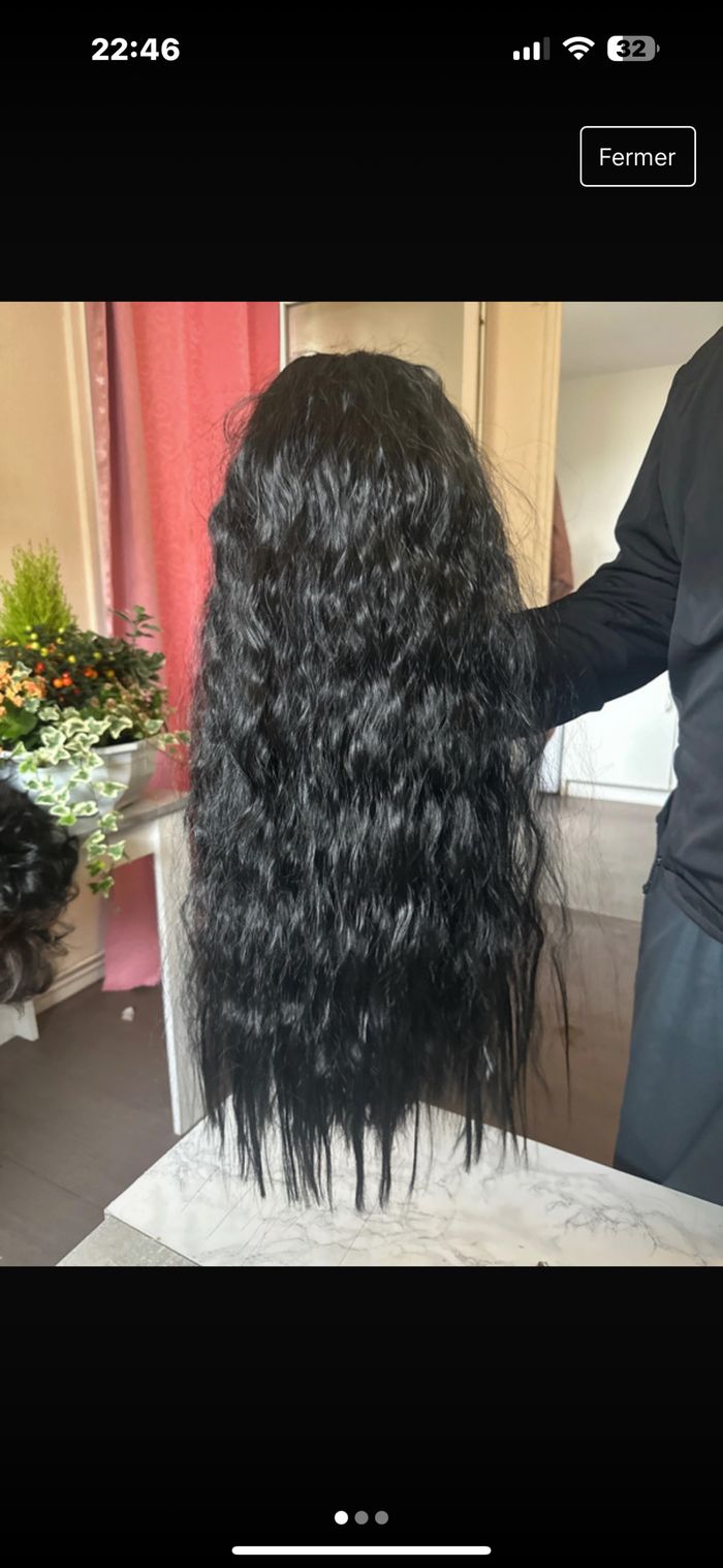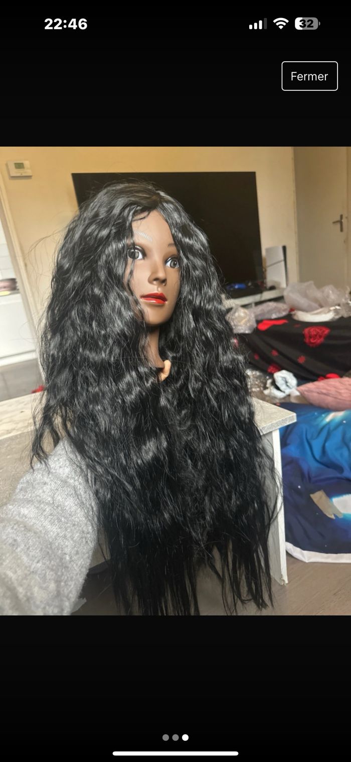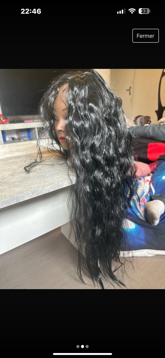 Superbe perruque ondulés noir en dentelle Fibre de cheveux synthétique haute qualités effet naturel et résistant à la chaleur on peut la lisser et la laver avec shampooing . Facile à mettre , tour de tête réglables -conforme au photos neuf -Prix bas car je vous fait déjà une réduction -envoie rapide même jour ou lendemain