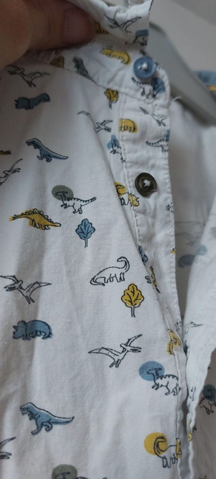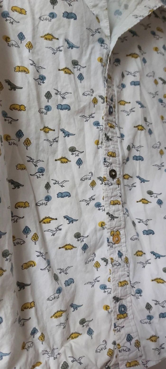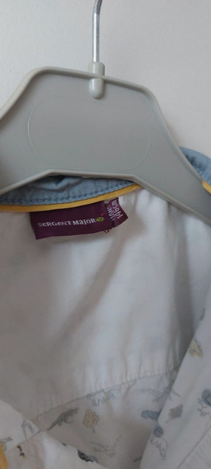 Très belle chemise Thème dinosaures Marque sergent major Très peu porté (juste un léger défaut sur un bouton mais n'empêche en rien la fermeture de la chemise, voir photo) Taille 11 ans