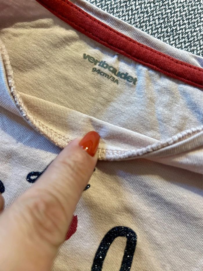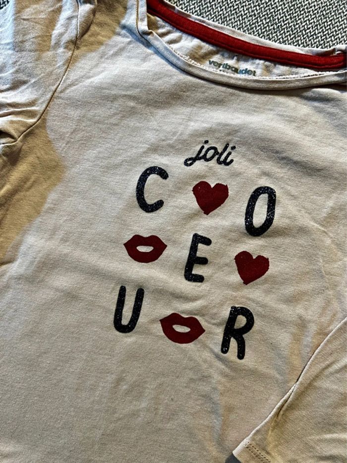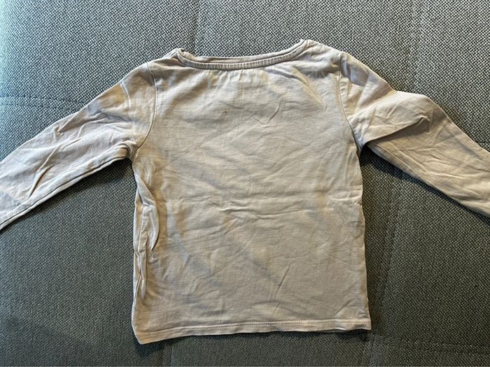 T-shirt à manches longues de couleur rose, clair avec un imprimé « joli cœur » (avec des paillettes ✨) Indiquer 3 ans, mais taille petits donc correspond à un 2 an