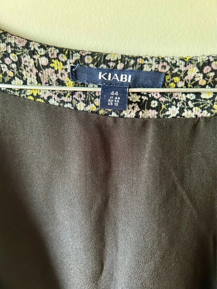 Robe légère type mousseline de couleur foncé avec des motifs fleuris blanc, jaune, rose. Doublée. Avec taille élastique. Taille 44 Largeur aisselle à aisselle : 52cm Longueur : 98cm
