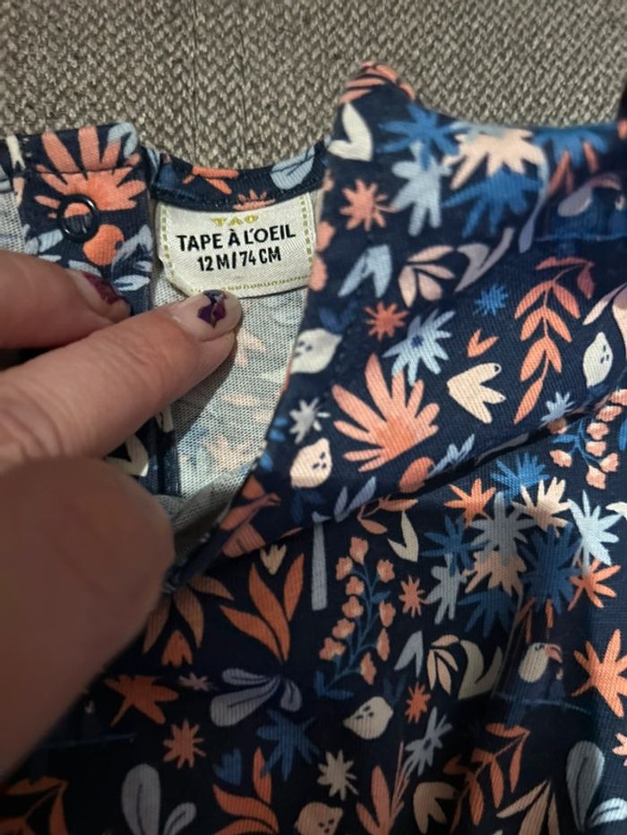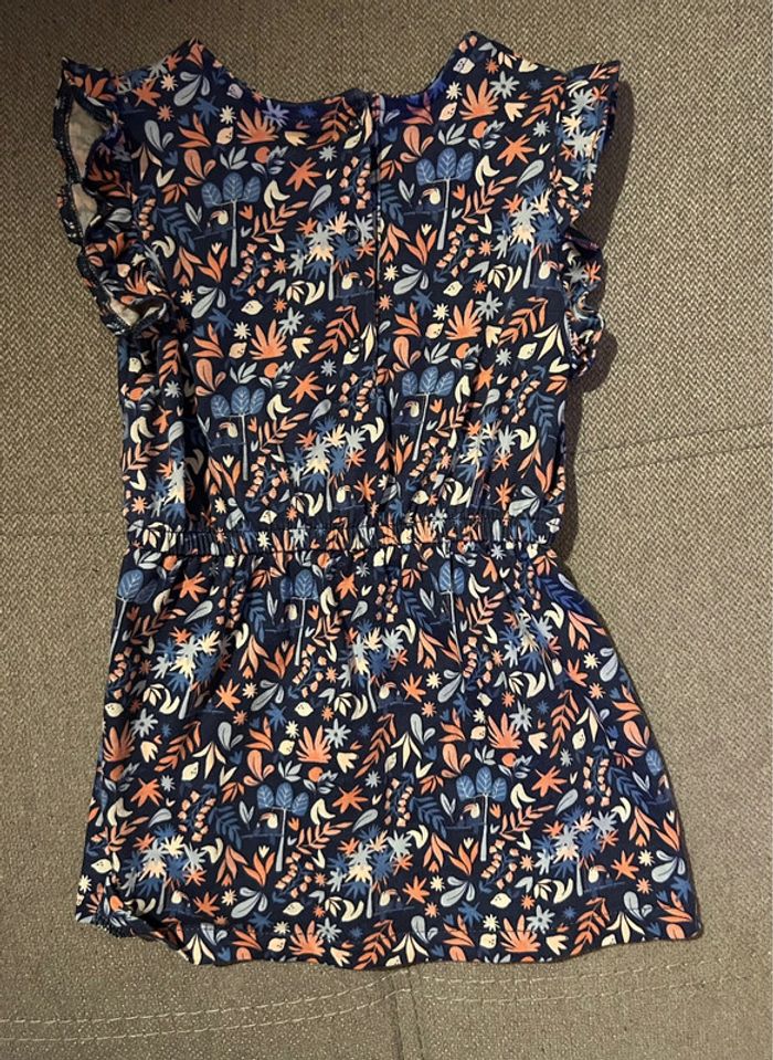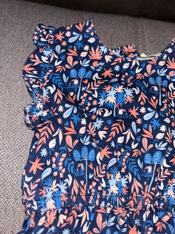 Robe été sans manches de couleur bleue et aux motifs fleuris. Volants sur les épaules et lien de serrage à la taille. Taille 12 mois