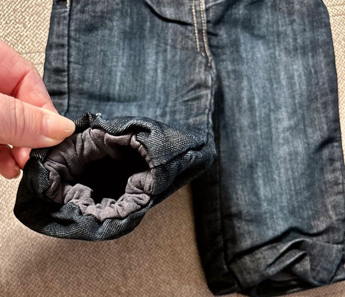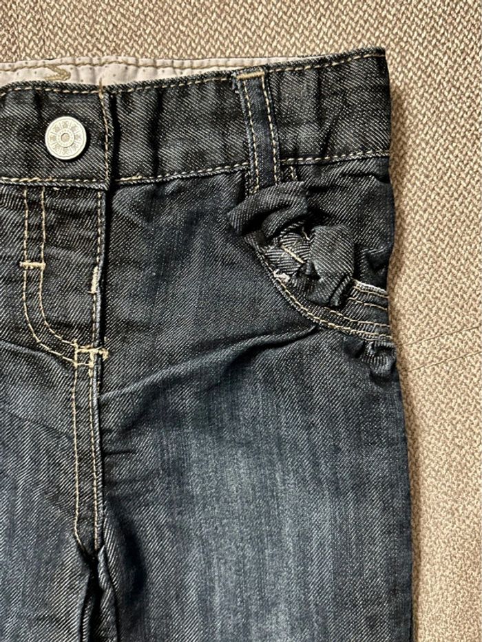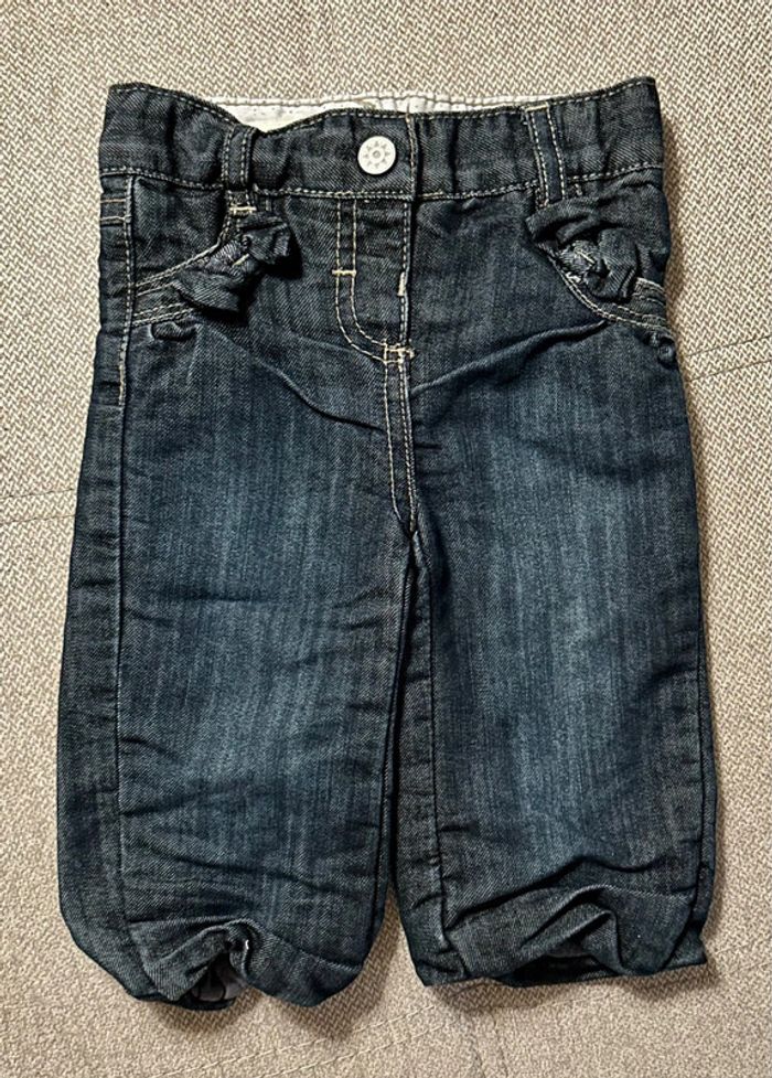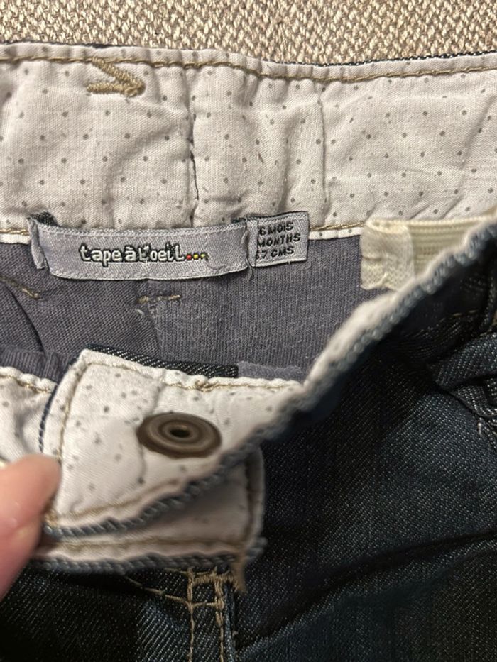 Jeans bas resserré, petits noeuds sur les poches. Comme neuf, porté 1 fois. Taille 6 mois