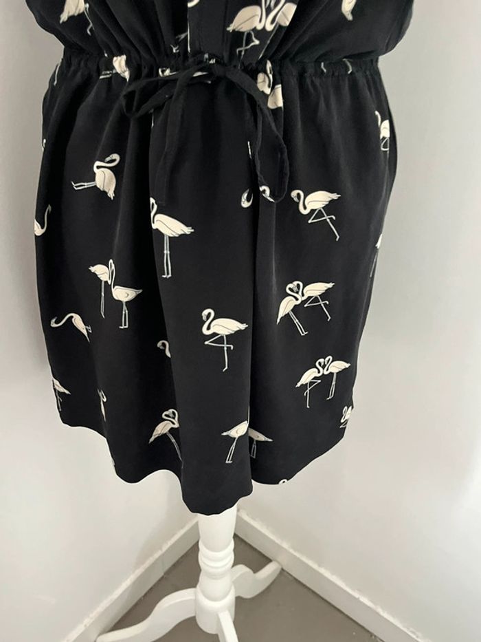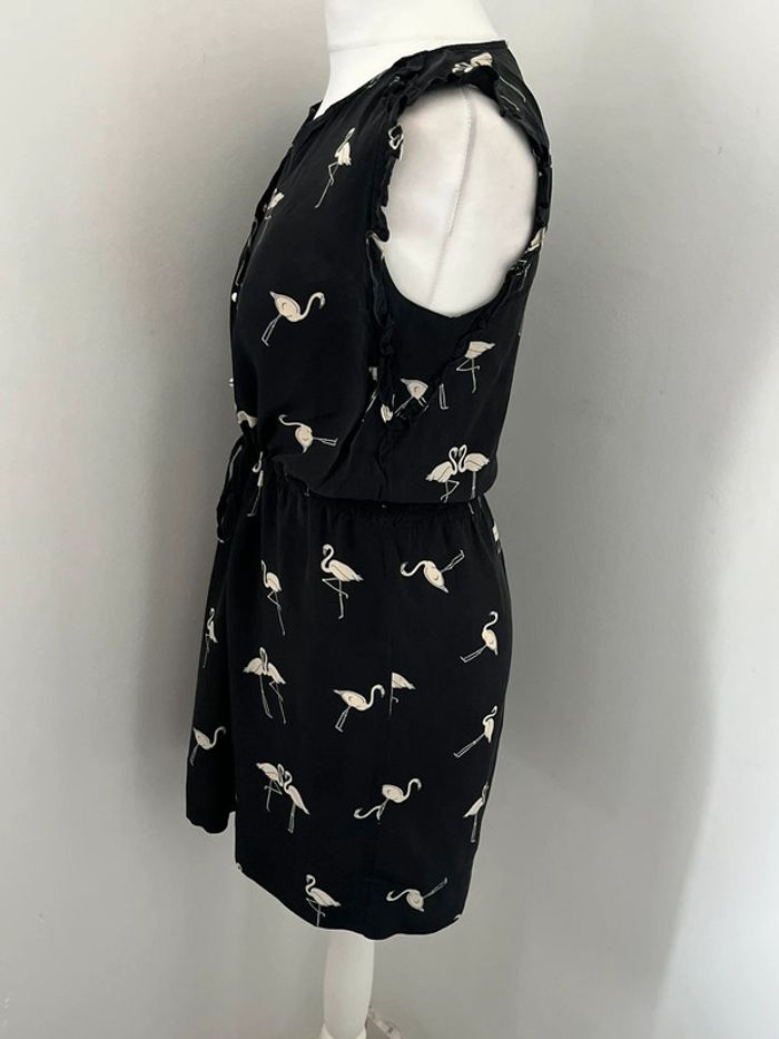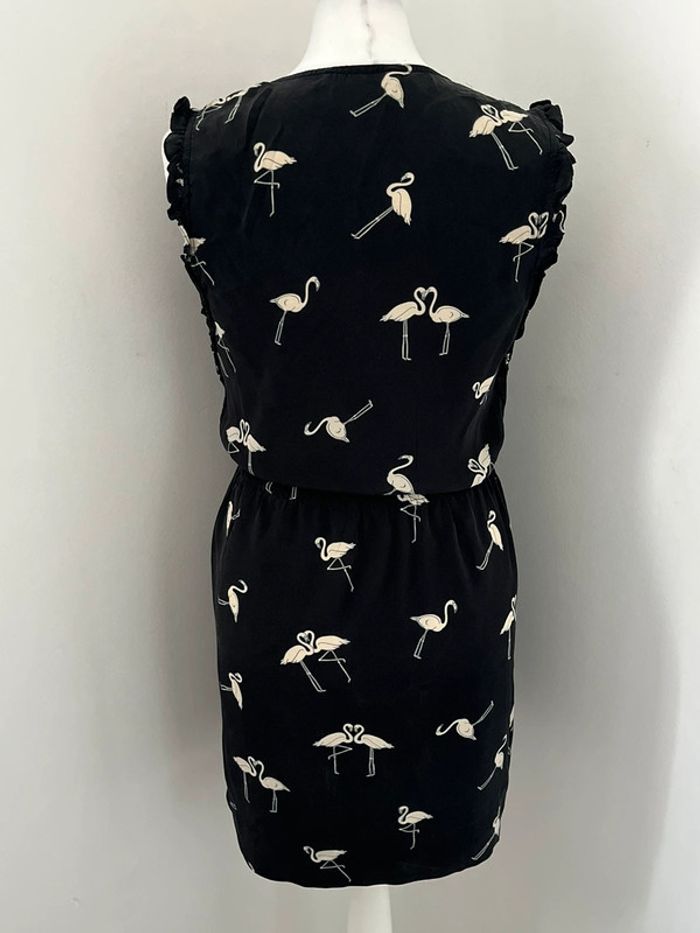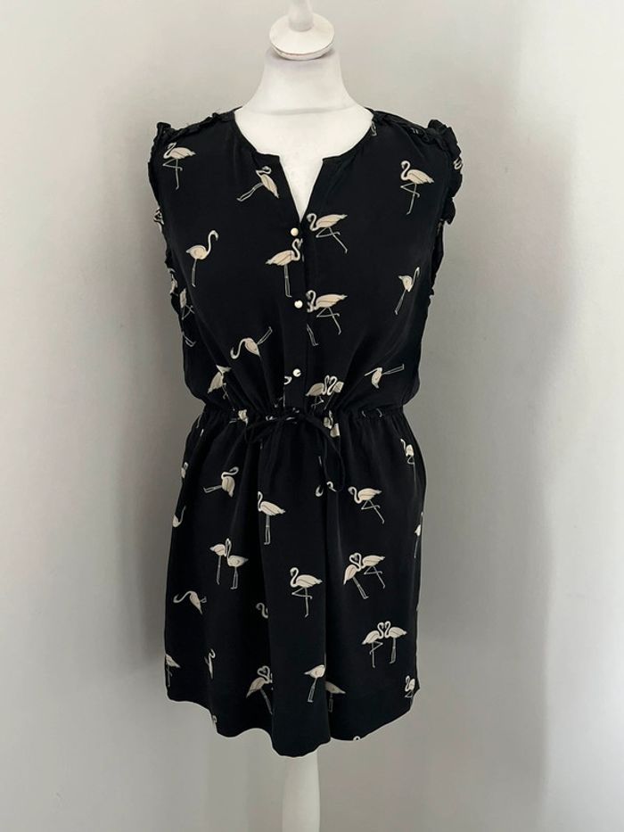 Vends jolie robe Sandro Soie Noire avec motifs flamands roses écrus Cintrée par un cordon Taille 1 #loumathifemmes #loumathirobe #loumathisandro 🌸 envoi rapide et soigné (Sous 48h ouvrées) 🌸 n’hésitez pas à faire un tour dans mon dressing pour voir mes autres pièces et faire des lots 🌸 n’hésitez pas à vous abonner à mon compte Vinted car j’ajoute des articles régulièrement