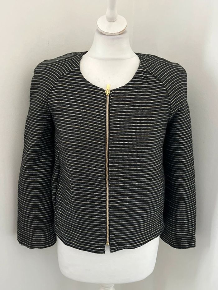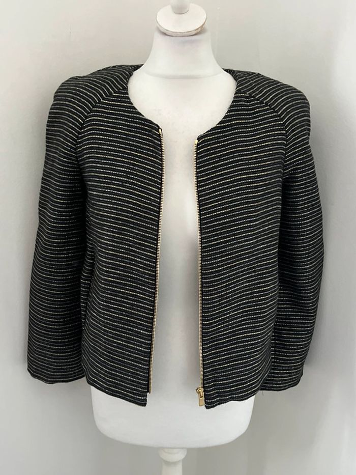 Vends joli blazer Bash Zippé avec fermeture éclair dorée Noire avec liserés argentés et dorés pailletés Taille 0 #loumathibash #loumathiveste #loumathifemmexs 🌸 envoi rapide et soigné (Sous 48h ouvrées) 🌸 n’hésitez pas à faire un tour dans mon dressing pour voir mes autres pièces et faire des lots 🌸 n’hésitez pas à vous abonner à mon compte Vinted car j’ajoute des articles régulièrement