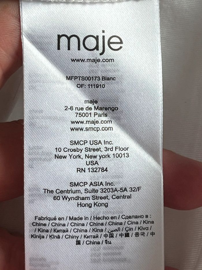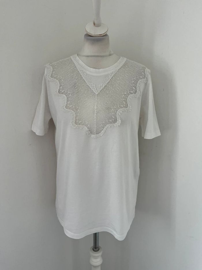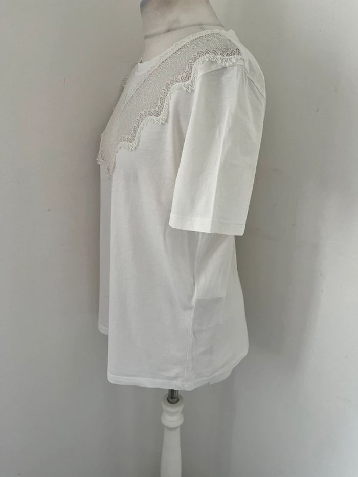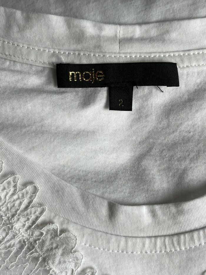 Vends joli t-shirt Maje Blanc avec empiècements en dentelle Taille 2 Parfait état (jamais porté ) #loumathimaje #loumathiblouse #loumathifemmem 🌸 envoi rapide et soigné (Sous 48h ouvrées) 🌸 n’hésitez pas à faire un tour dans mon dressing pour voir mes autres pièces et faire des lots 🌸 n’hésitez pas à vous abonner à mon compte Vinted car j’ajoute des articles régulièrement