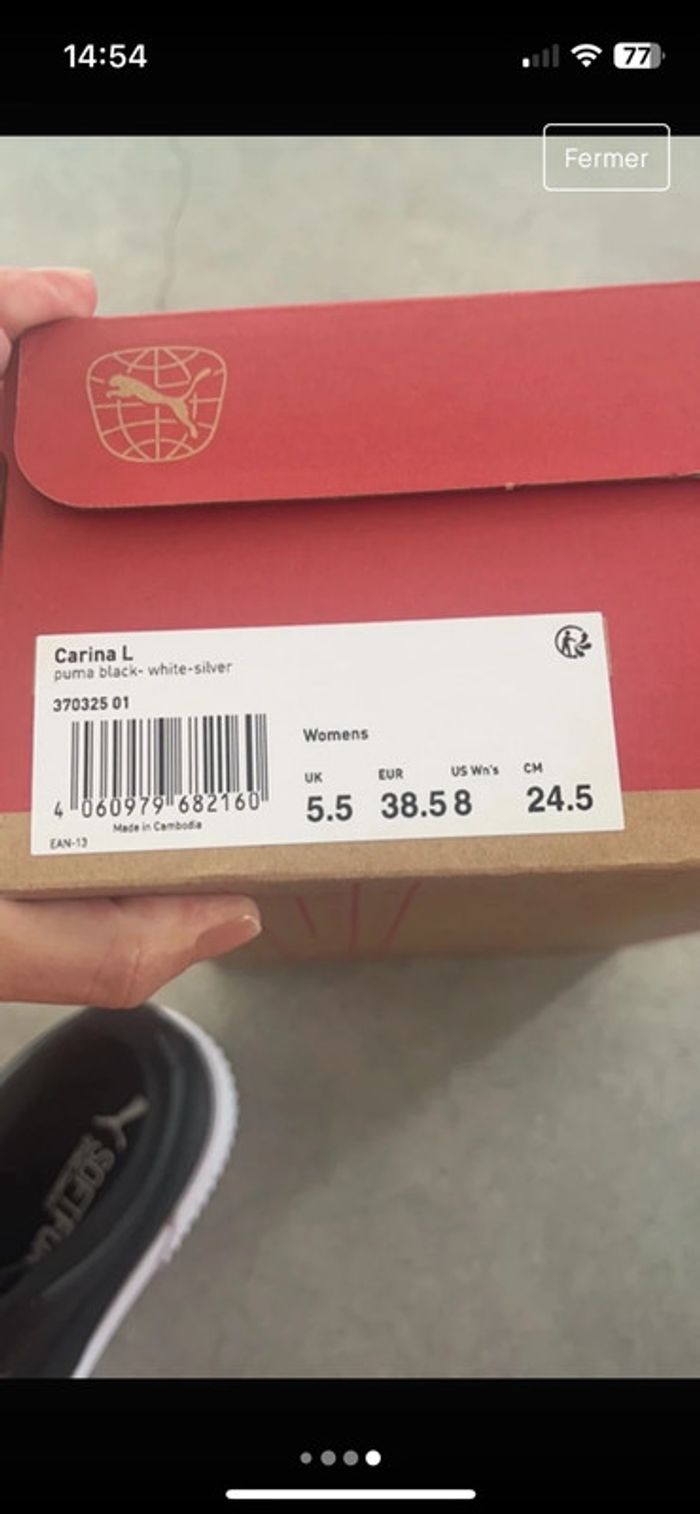 CONTACTEZ MOI POUR LES LOTS !!! Vends jolie paire de baskets Neuves dans leur boîte Puma Carina Pointure 38,5 Cuir noir et semelles compensées blanches #loumathichaussures 🌸 envoi rapide et soigné (Sous 48h ouvrées) 🌸 n’hésitez pas à faire un tour dans mon dressing pour voir mes autres pièces 🌸 étant pro, vous ne pouvez pas créer de lot, envoyez moi un message si plusieurs articles vous intéressent, je vous créerai une annonce 🌸 n’hésitez pas à vous abonner à mon compte Vinted car j’ajoute des articles régulièrement
