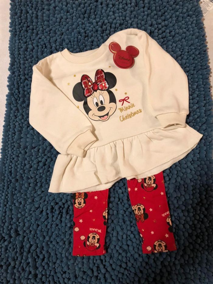 Ensemble comprenant un sweat (tunique) couleur crème et un leggings caleçon rouge avec Minnie pour Noël Taille 18/24 mois 92 cm Disney jamais porté n e u f