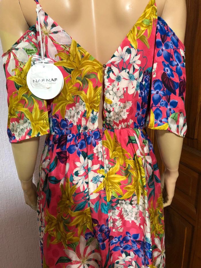 Longue robe d'été à fleurs multicolore (rose, blanc, turquoise, jaune moutarde, blanc) très chic et estivale Naf Naf Taille 38 manches volantées qui peuvent être portées différemment n e u v e avec eti que tte (valeur 139€) jamais portée
