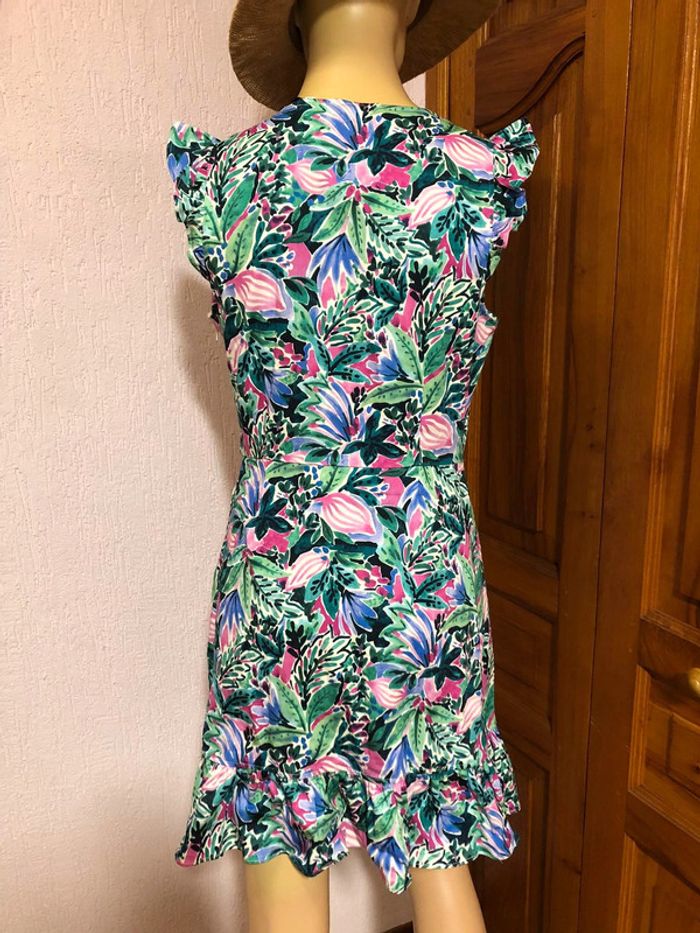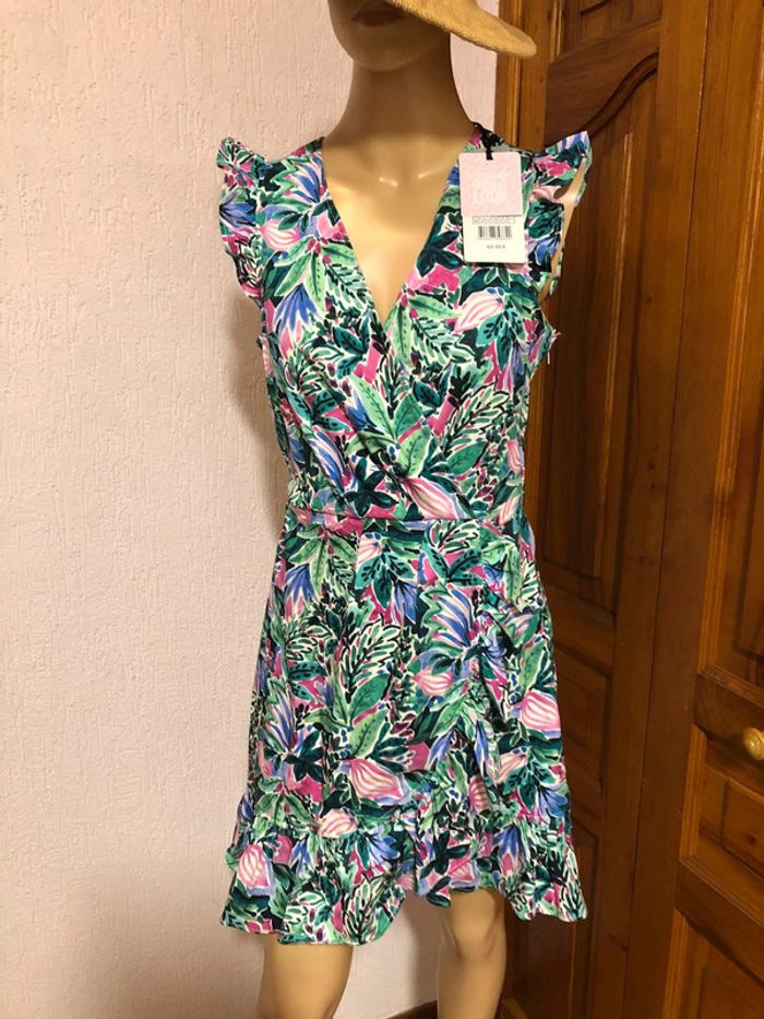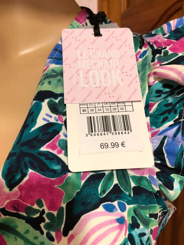 Robe cache coeur d'été avec motifs tropicaux (fleurs, feuilles) bas de la robe / jupe avec volants joli décolleté fermeture éclair sur le coté tissu non extensible Naf Naf taille 40 jamais portée (valeur 69.99€) #nafnaf #robe #mllenafnaf_nafnaf