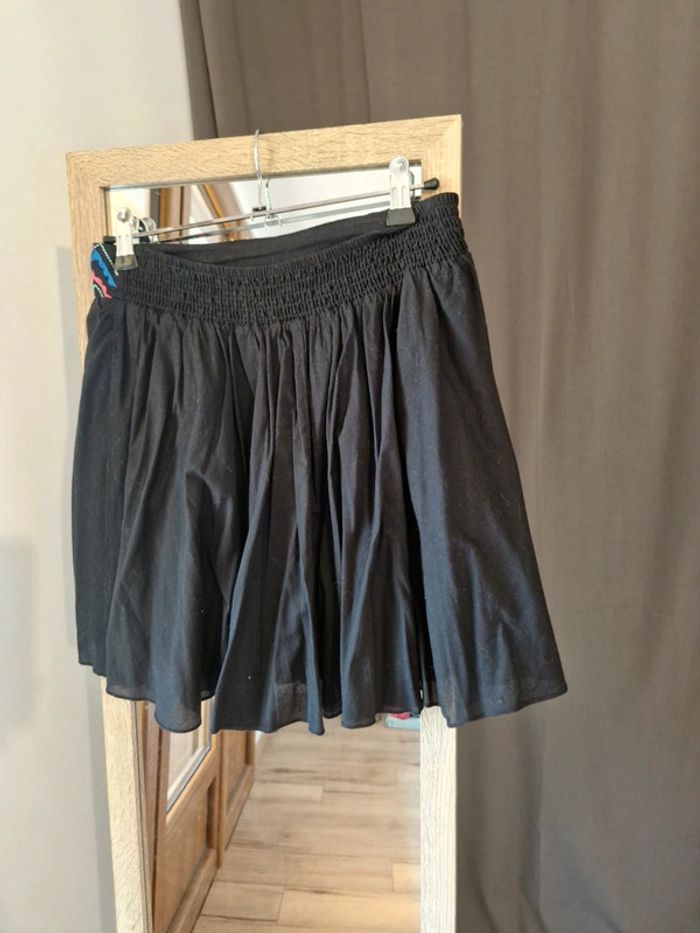 Jupe courte asymétrique noire et motifs bleu et rose Marque Mim Taille S Très peu porté, comme neuve