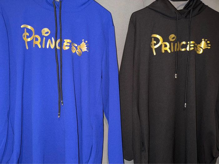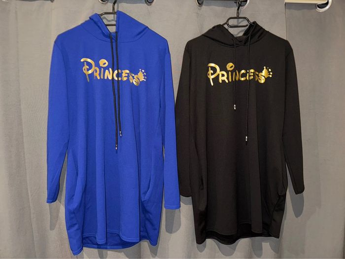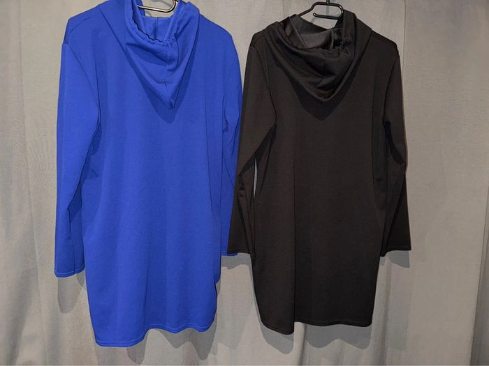 Tunique «  princess👑 » avec capuche Taille unique ( pouvant aller jusqu’à un taille 46) Couleur noire et bleu roi ( parfait état porté 1 seule fois chacune. Longueur tunique : 81 cm ( elles sont à l’unité sur mon dressing)