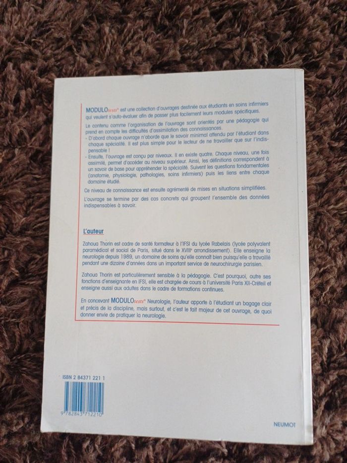 MODULOtests- est une collection d'ouvrages destinée aux étudiants en soins infirmiers qui veulent s'auto-évaluer afin de passer plus facilement leurs modules spécifiques. Le contenu comme l'organisation de l'ouvrage sont orientés par une pédagogie qui prend en compte les difficultés d'assimilation des connaissances. D'abord chaque ouvrage n'aborde que le savoir minimal attendu par l'étudiant dans chaque spécialité Il est plus simple pour le lecteur de ne travailler que sur l'indispensable ! Ensuite, l'ouvrage est conçu par niveaux. Il en existe quatre. Chaque niveau, une fois assimilé, permet d'accéder au niveau supérieur. Ainsi, les définitions correspondent à un savoir de base pour appréhender la spécialité. Suivent les questions fondamentales (anatomie, physiologie, pathologies, soins infirmiers) puis les liens entre chaque domaine étudié. Ce niveau de connaissance est ensuite agrémenté de mises en situations simplifiées. L'ouvrage se termine par des cas concrets qui groupent l'ensemble des données indispensables à savoir.