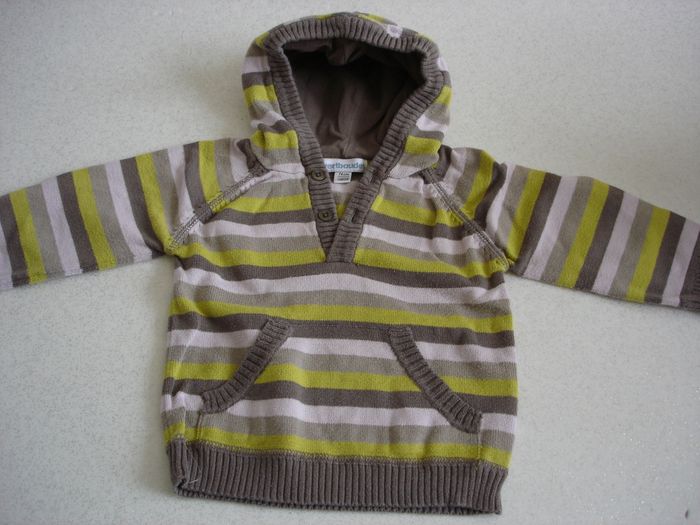 Magnifique petit PULL à capuche - 12 mois "VERTBAUDET" couleur: MARRON / VERT / KAKI.... à rayures Matière: 100% COTON PULL, porté juste 1 fois, comme NEUF