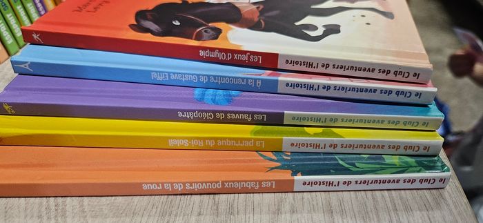 Lot de 5 livres Mc Do Serie : Le club des aventuriers de l'histoire Les jeux d'olympe A la rencontre de Gustave Eiffel Les fauves de Clépoâtre La perruque du Roi- Soleil Les fabuleux pouvoirs de la roue En très bon état. Vendu en lot