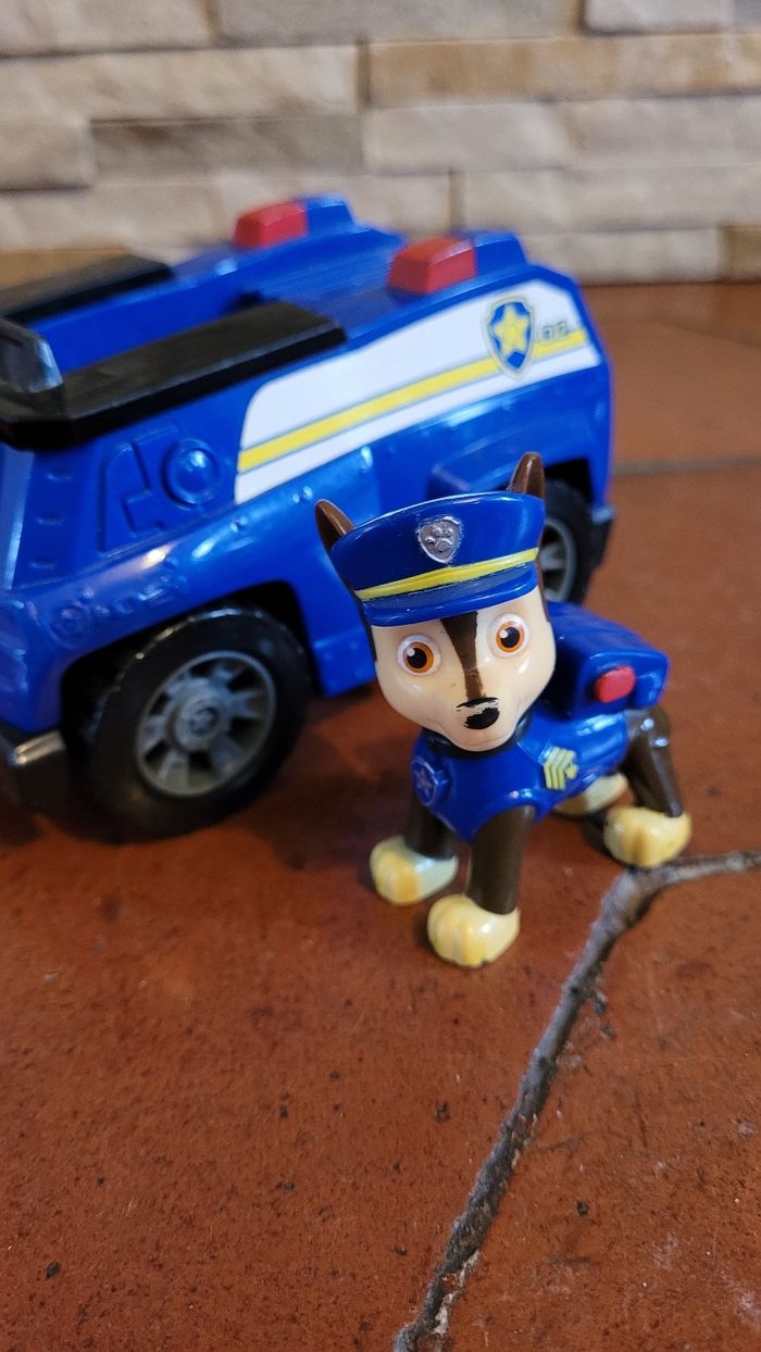 Chien policier Chase de la Pat patrouille et son véhicule. Bout du nez effacé. 14cm