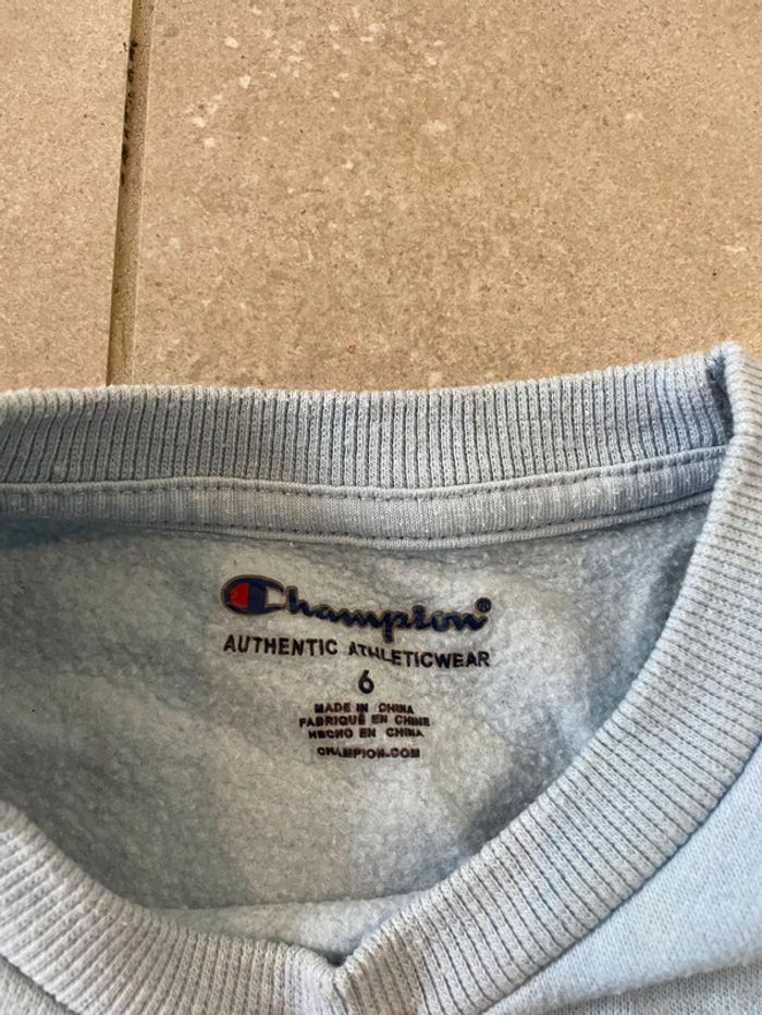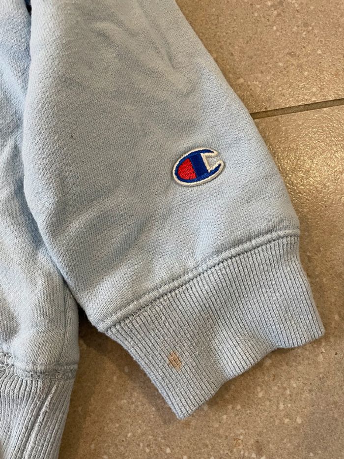 Pull bleu clair Champion 6 ans, bon état mais petite tâche - photo numéro 1