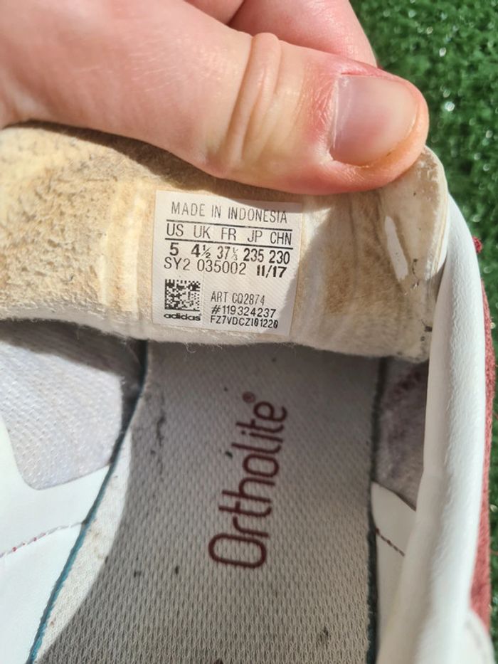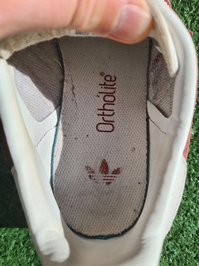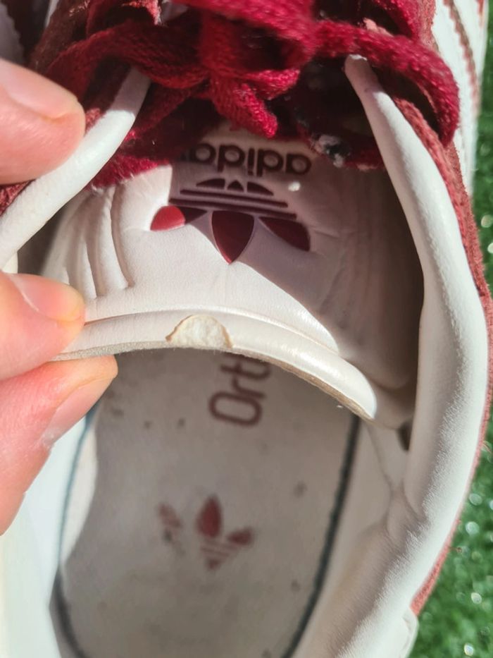 ✨️A VENDRE✨️ ➡️ La paire est nettoyée et désinfectée par mes soins. J'applique également un spray qui préserve le textile et imperméabilise le nubuck contre la pluie et l'humidité. ➡️ J'ai repeint moi-même la partie visible de la semelle extérieure avec trois couches de peinture blanche pour sneakers + une couche de vernis mat. ➡️ Quelques tâches visiblent sur la dernière photo + une languette un peu abimée. ⚠️ Ne pas mettre à la machine à laver. ⚠️ Sensible aux frottements, à réserver pour un usage normal. ⚠️ Je vous invite à zoomer minutieusement sur chaque photo. Vous achetez ce que vous voyez. 📦 Expédition sous 48h en semaine si paiement avec Mondial Relay et Chronopost. ➡️ Retrouve les autres paires à ta taille en cliquant ici : #SNEAKCORP37 🔔 Abonne toi pour trouver chaussure à ton pied! #ADIDAS #VINTAGE #GAZELLE #OG #BOLD #BUSENITZ #CAMPUS #SAMBA #SUPERSTAR #HAMBURG #SPEZIAL #MUNCHEN #DRAGON #CHAUSSURES #SPORT #SHOES #SNEAKERS #STREETWEAR #COURT #RED