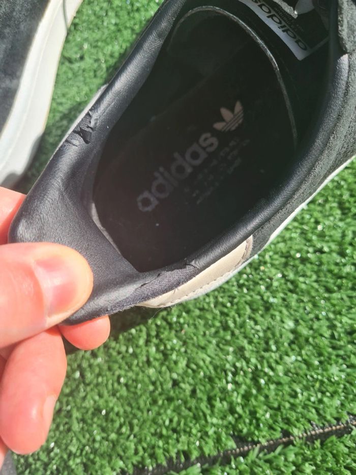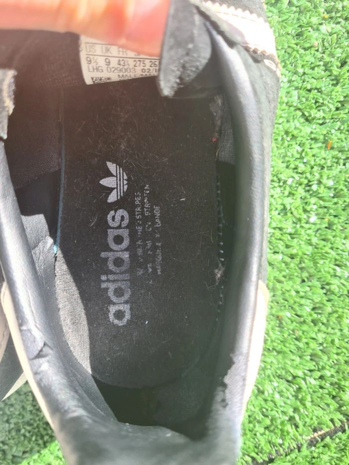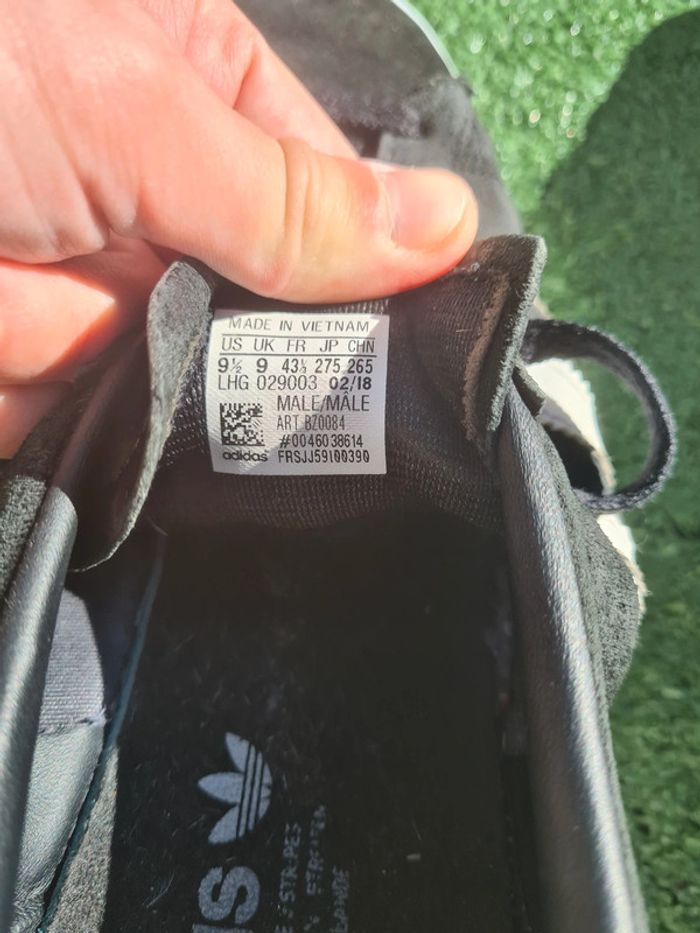 ✨️A VENDRE✨️ ➡️ La paire est nettoyée et désinfectée par mes soins. J'applique également un spray qui préserve le textile et imperméabilise le nubuck contre la pluie et l'humidité. ➡️ J'ai repeint moi-même la partie visible de la semelle extérieure avec trois couches de peinture blanche pour sneakers + une couche de vernis mat. ➡️ Revêtement légèrement abimé autour des chevilles (cf dernière photo). Pas vraiment visible car noir sur noir. ⚠️ Ne pas mettre à la machine à laver. ⚠️ Sensible aux frottements, à réserver pour un usage normal. ⚠️ Je vous invite à zoomer minutieusement sur chaque photo. Vous achetez ce que vous voyez. 📦 Expédition sous 48h en semaine si paiement avec Mondial Relay et Chronopost. ➡️ Retrouve les autres paires à ta taille en cliquant ici : #SNEAKCORP43 🔔 Abonne toi pour trouver chaussure à ton pied! #ADIDAS #VINTAGE #GAZELLE #OG #BOLD #BUSENITZ #CAMPUS #SAMBA #SUPERSTAR #HAMBURG #SPEZIAL #MUNCHEN #DRAGON #CHAUSSURES #SPORT #SHOES #SNEAKERS #STREETWEAR #COURT #BLACK