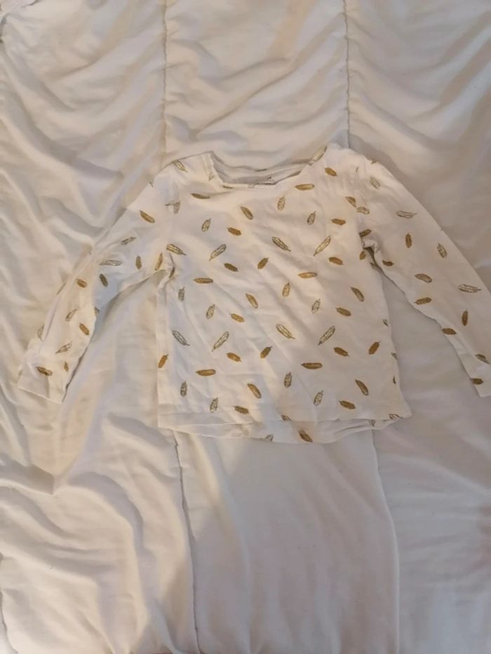 Tee shirt long blanc avec des plumes dorées. 4 ans