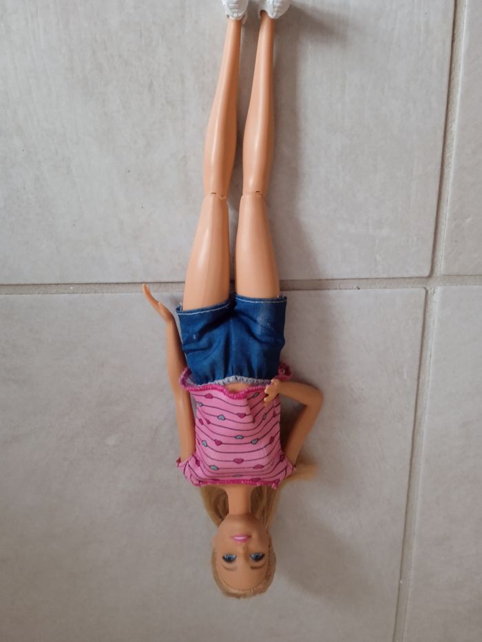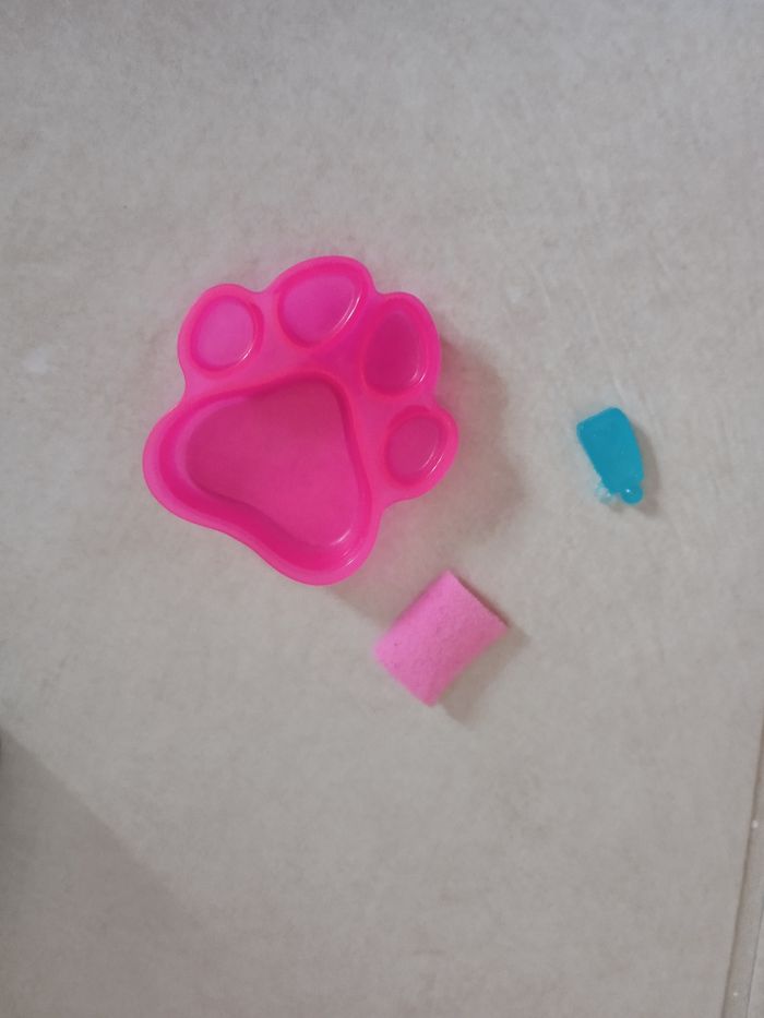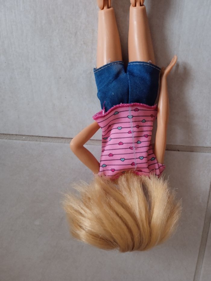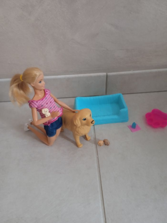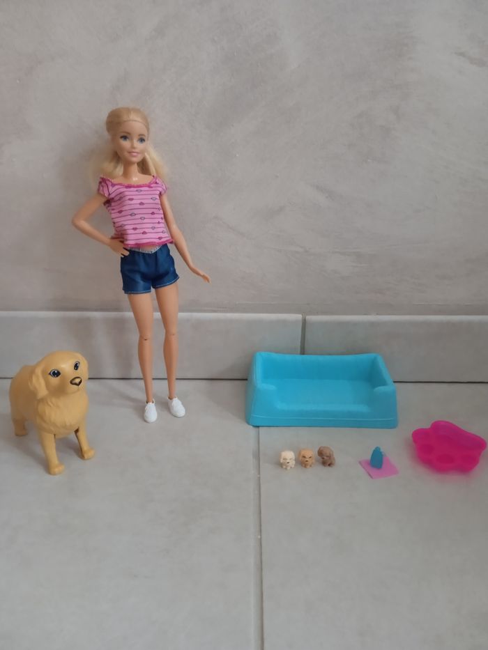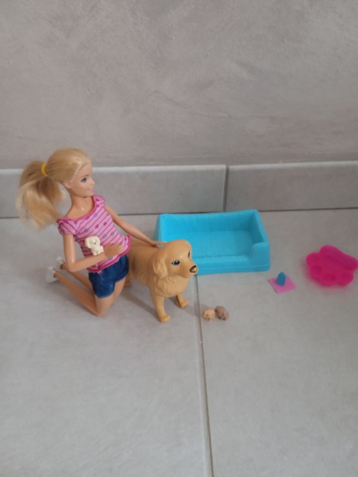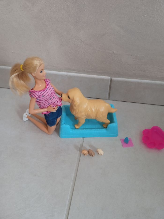 Comprends le chien, trois chiots une bouteille ,une couverture, un plateau en forme de pâte, un canapé et la Barbie articulé.