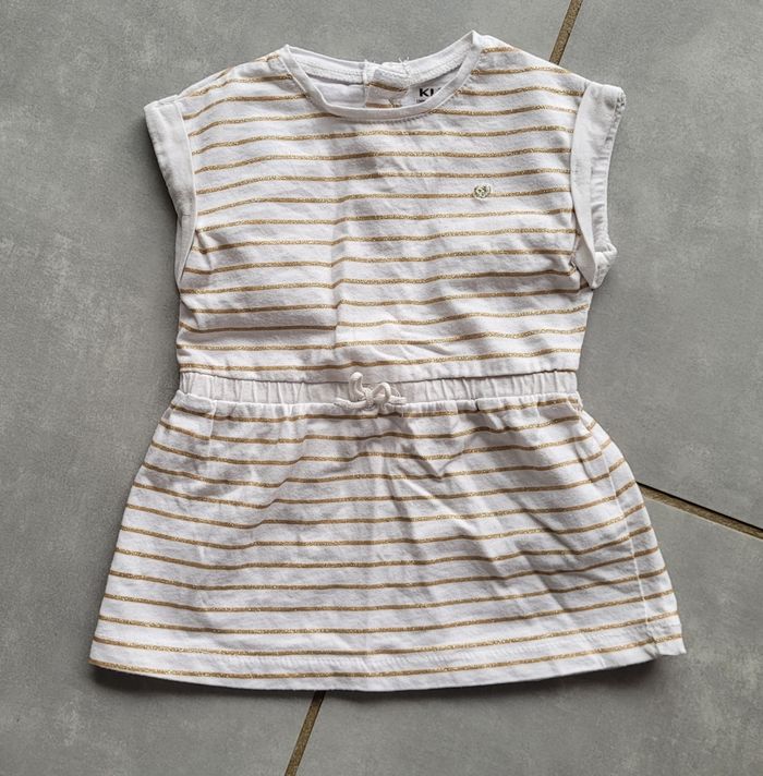 Robe fluide, très jolie, de couleur blanche rayée dorée, avec petit coeur argenté, de la marque Kiabi, taille 3 mois (56-62 cm), en très bon état. Article lavé pour la vente. #3moislae72