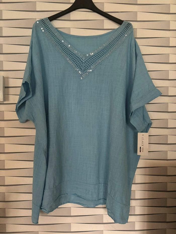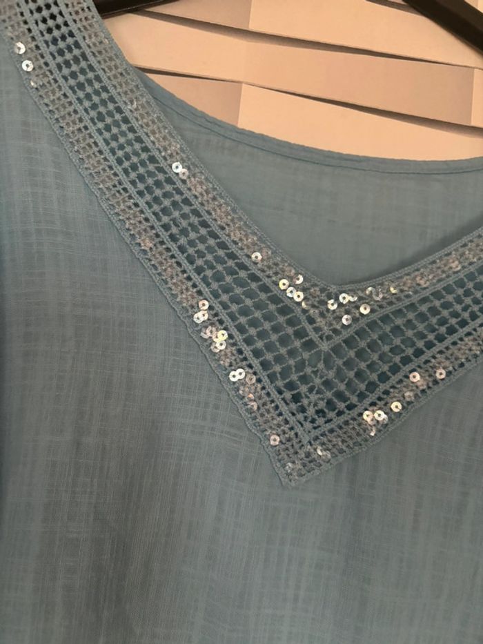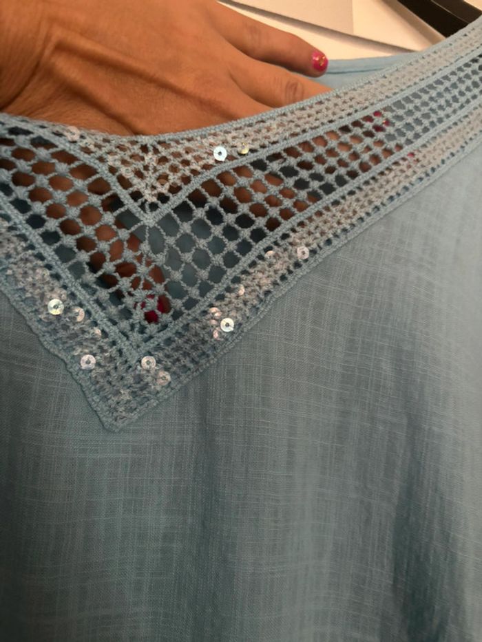 tunique bleu ciel jolie finition au décolleté taille unique convient du 38 au 42 sur neuve avec étiquette jamais porté 🌸n’hésitez pas à visiter mon dressing et mon profil sa n’engage à rien et peut être vous trouverez votre bonheur en lot j’ai plein de choses à petit prix et remise lot activé ( plus économie des frais de port ) si lot de plus de 5 articles je rajoute une remise supplémentaire à la remise du lot 🌸 j’ajoute très régulièrement et ci celui-ci vous plais pensez à me suivre afin d’avoir les notifications des nouveautés 🌸 😊