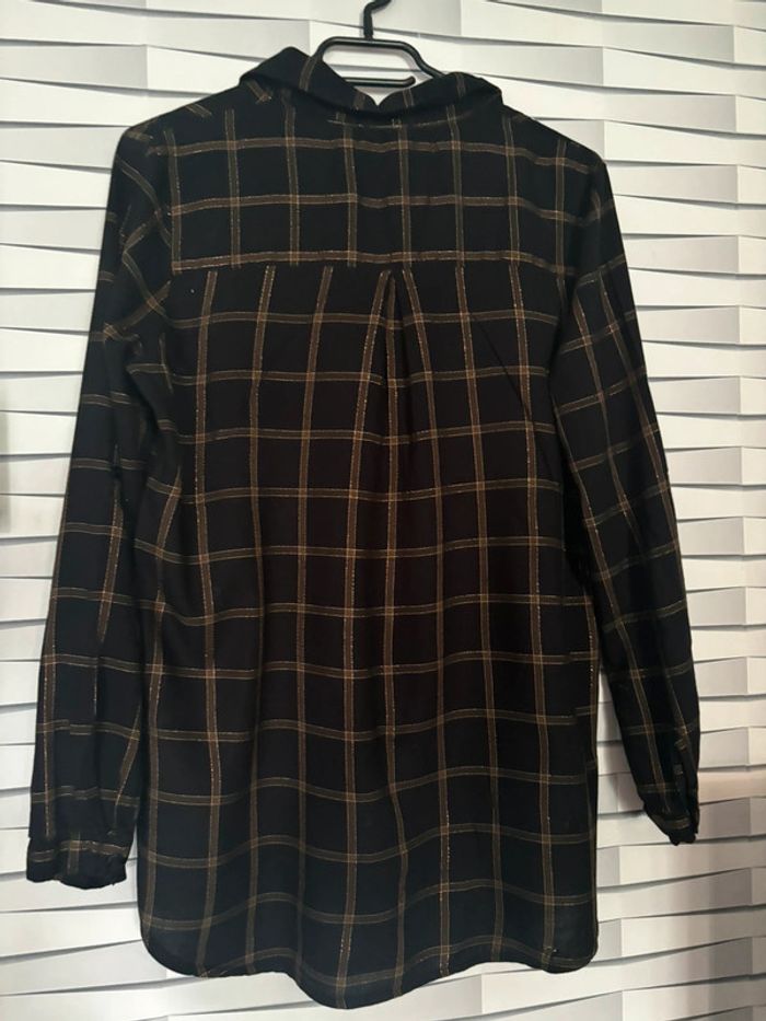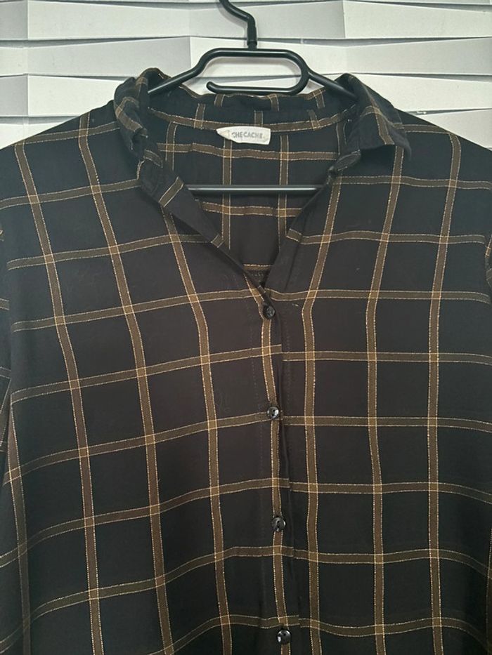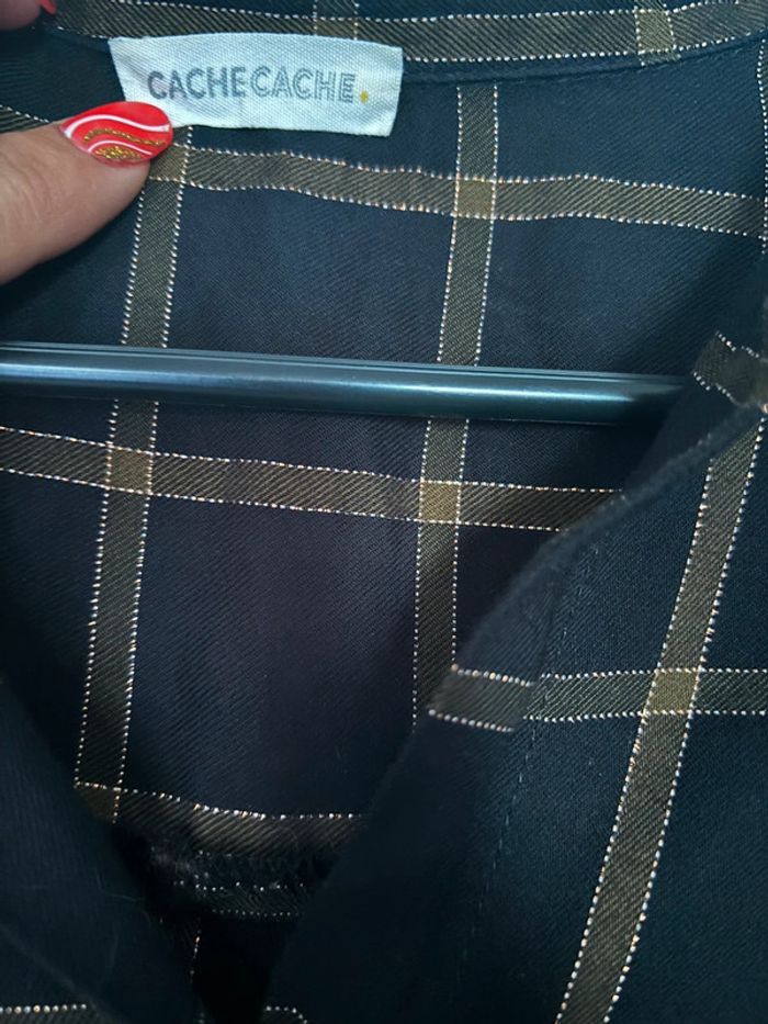 belle chemise noir à rayure doré de chez cache cache 🌸n’hésitez pas à visiter mon dressing et mon profil sa n’engage à rien et peut être vous trouverez votre bonheur en lot j’ai plein de choses à petit prix et remise lot activé ( plus économie des frais de port ) si lot de plus de 5 articles je rajoute une remise supplémentaire à la remise du lot 🌸 j’ajoute très régulièrement et ci celui-ci vous plais pensez à me suivre afin d’avoir les notifications des nouveautés 🌸 😊