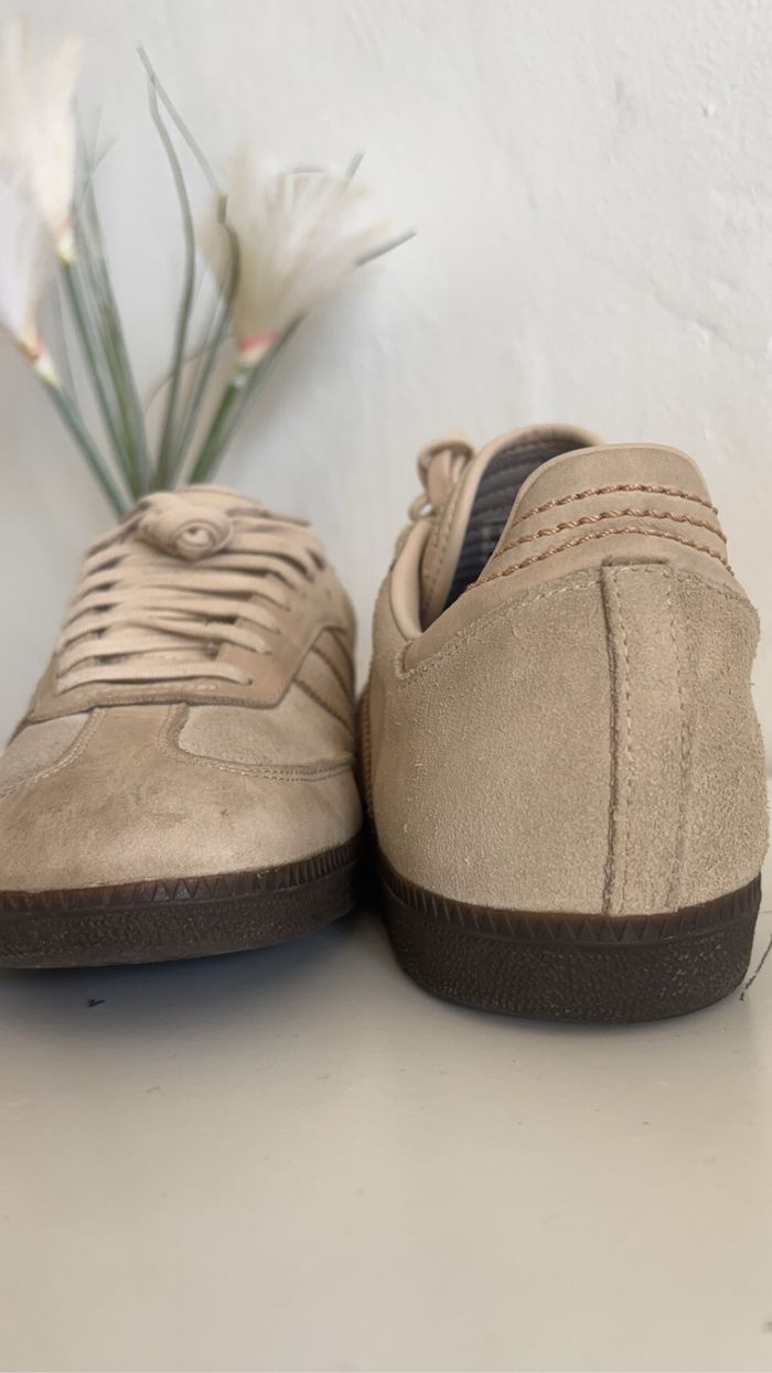 Adidas Samba couleur beige en tres bon état. Elles sont à la fois stylées et confortables, parfaites pour compléter un look décontracté ou vintage. Les chaussures présentent un seul défaut : deux petits trous au niveau de la semelle (voir photo). Cependant, cela ne gêne en rien leur utilisation et n’affecte pas le confort. Pour plus de détails, n’hésitez pas à me contacter !
