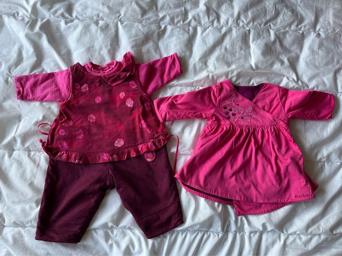 Lot composé d'une combinaison et d'une robe réversible taille 6 mois. Combinaison : boutons classiques au dos et pression à l'entrejambe. Robe coupe ample, fermeture par 2 boutons pression sur le côté (effet cache-coeur)
