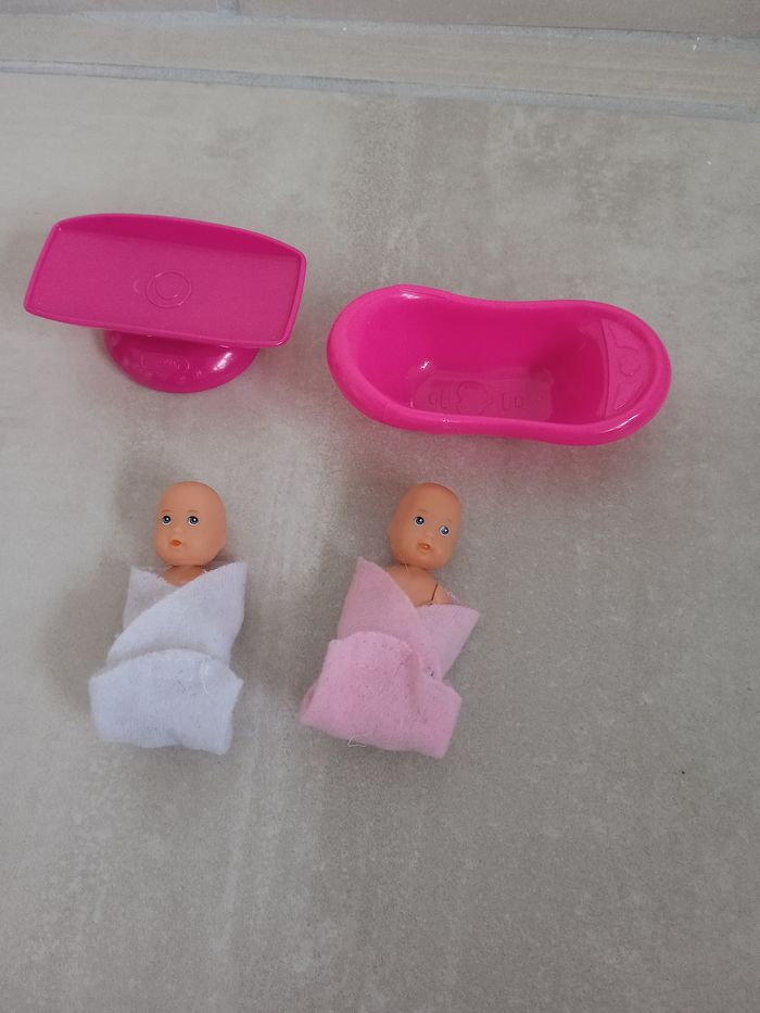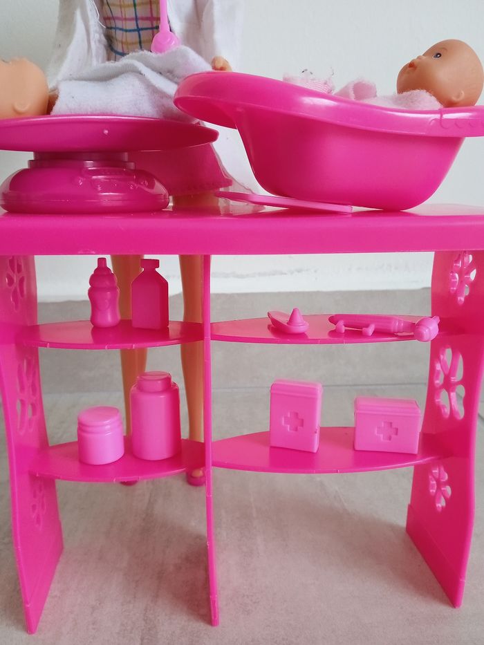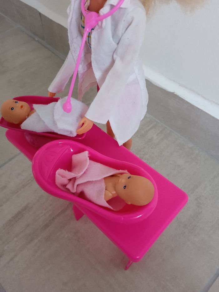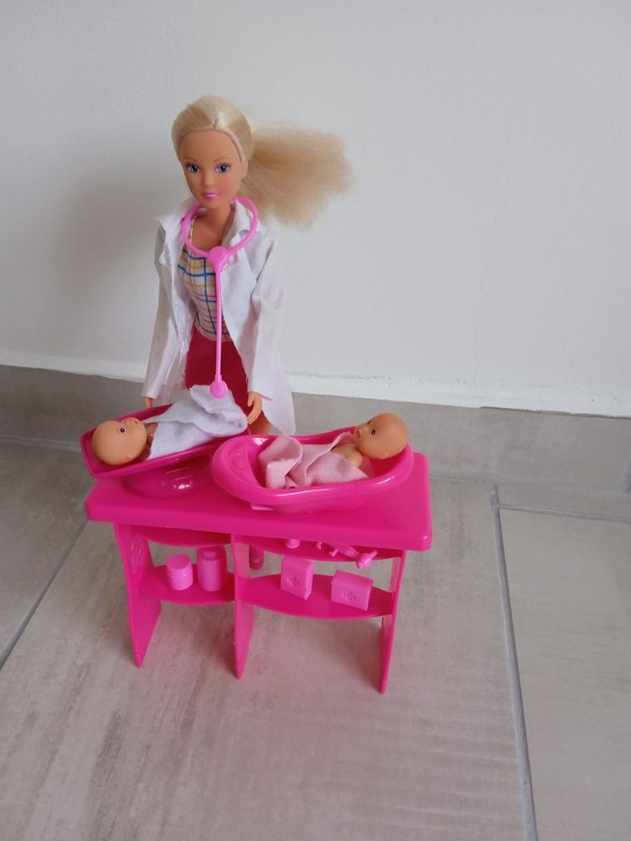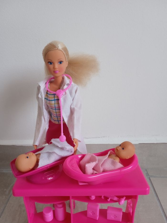 Poupée Steffi 29 cm en pédiatre. Comprends de bébé de 5 cm ainsi que de nombreux accessoires pour prendre soin des bébés : une balance, une baignoire, un stéthoscope, en octoscope , deux serviettes ,des médicaments, un biberon... La table contient plusieurs étagères pour ranger tous les éléments. Marque Simba toys. Une des chaussures de la poupée et fissurée voir photos mais ne gêne rien à son utilisation. Ainsi que les cheveux de la poupée ont été brossé reste en très bon état. #jeusociéténade3033 #joueteducatifnade3033 #jouetenfantnade3033 #poupéenade3033