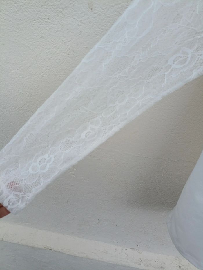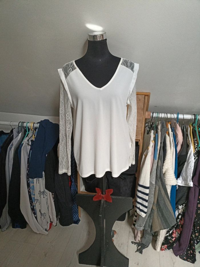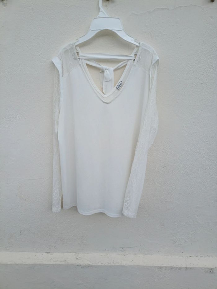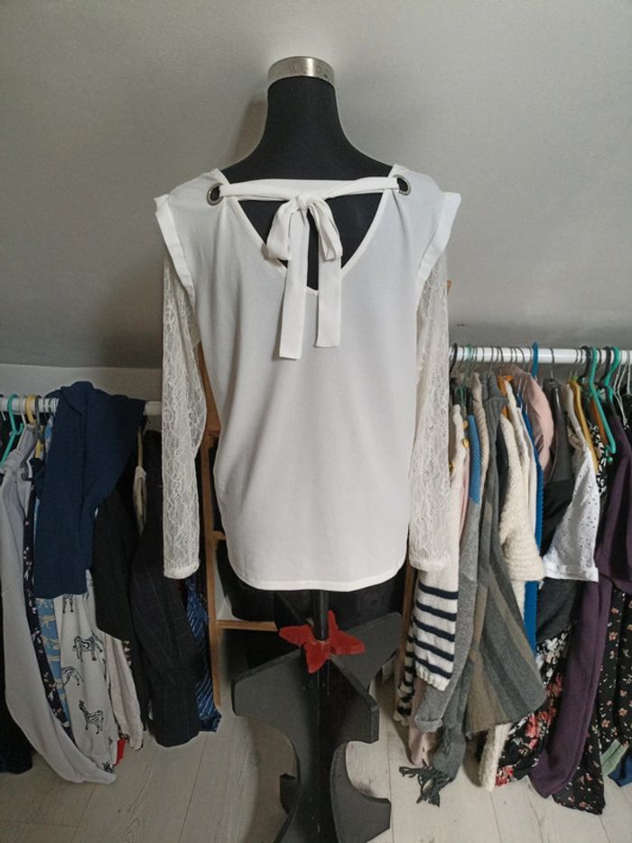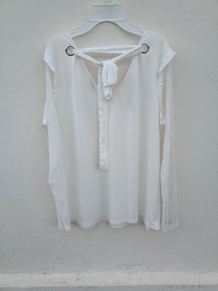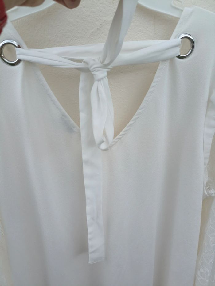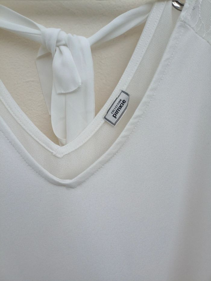 Blouse Pimkie blanche , détail dentelle et noeud , taille L. Un petit point tiré, rien de méchant.