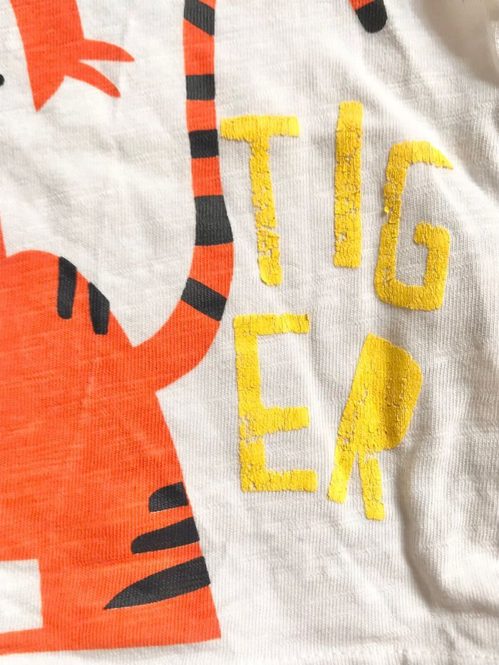 T-shirt blanc à motif de lapin à lunettes T-shirt blanc à motifs jungle et tigre Le texte « tiger » est usé Petites tâches au dos
