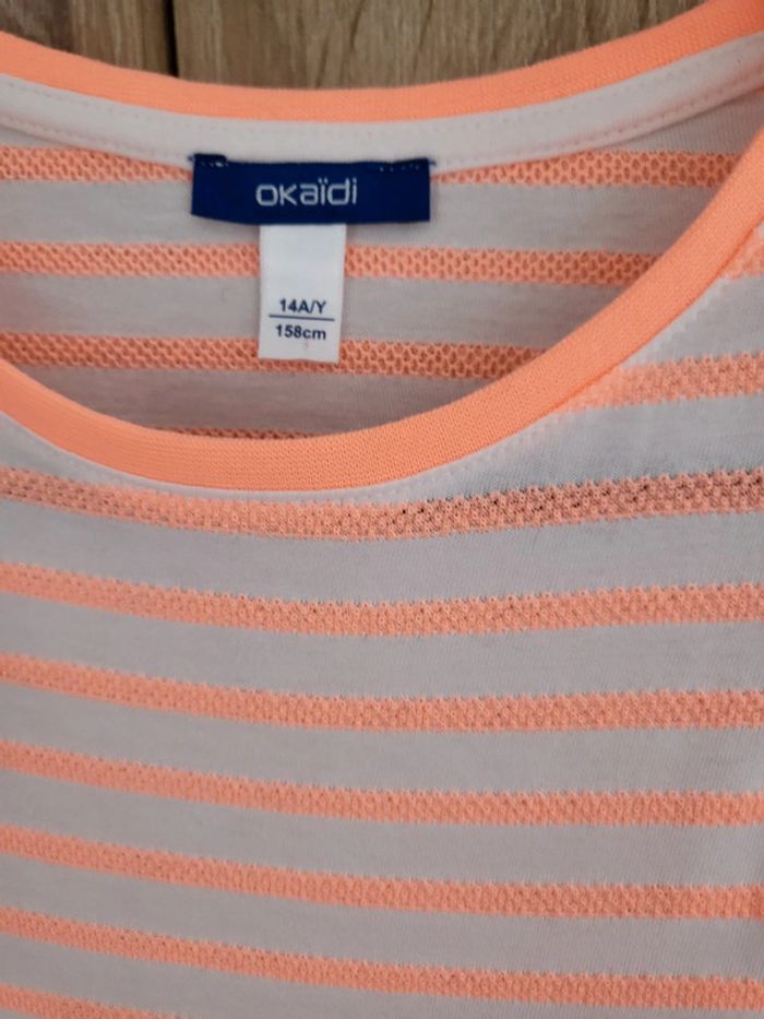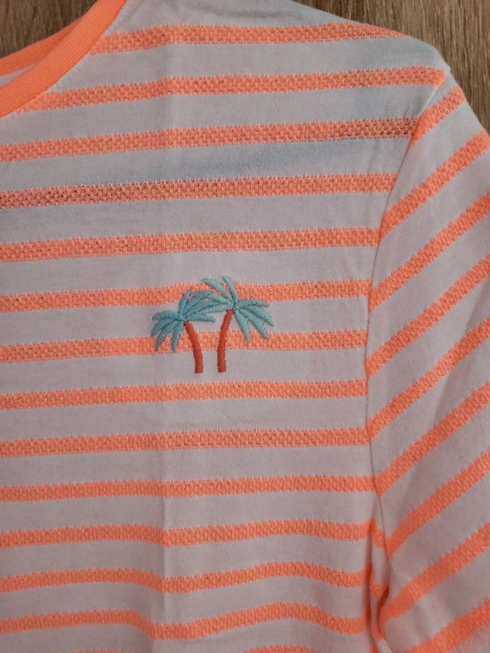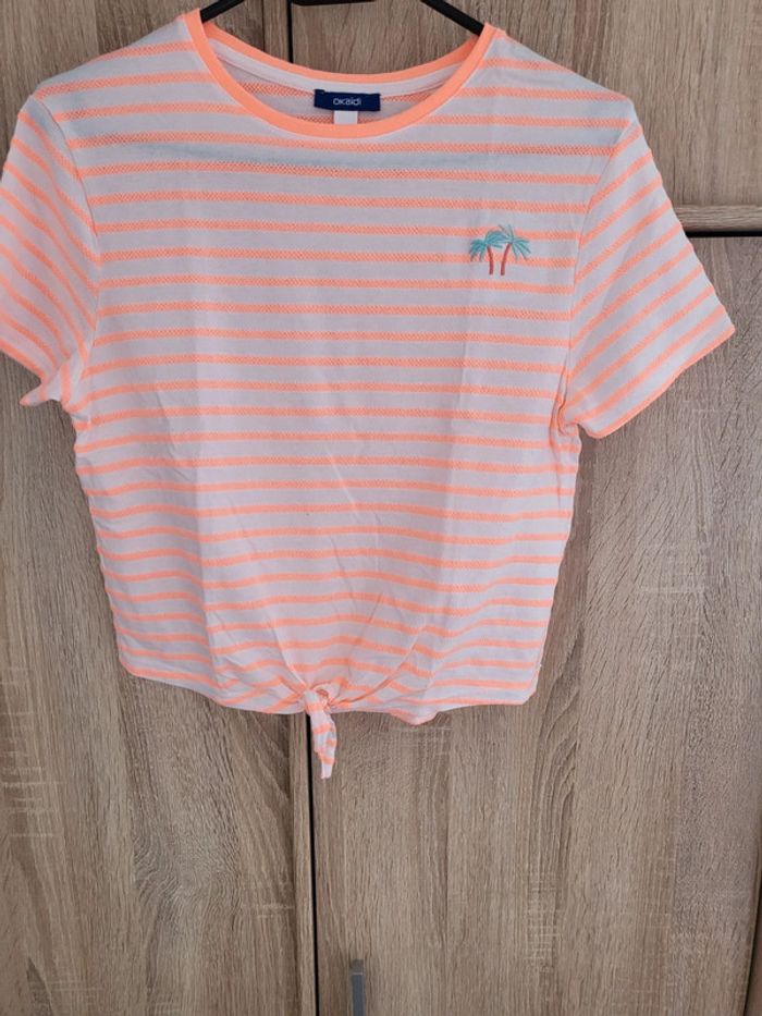 🪷Tee-shirt MC 🪷Blanc a rayure orange fluo avec petit palmier et noeud en bas 🪷Neuf 🪷Taille 14ans (158cm) #cindyado14ans