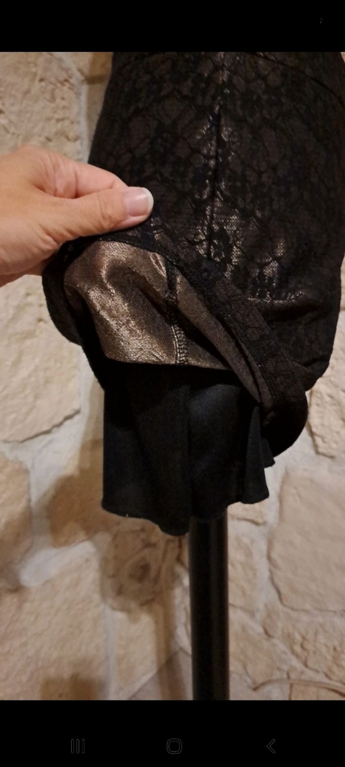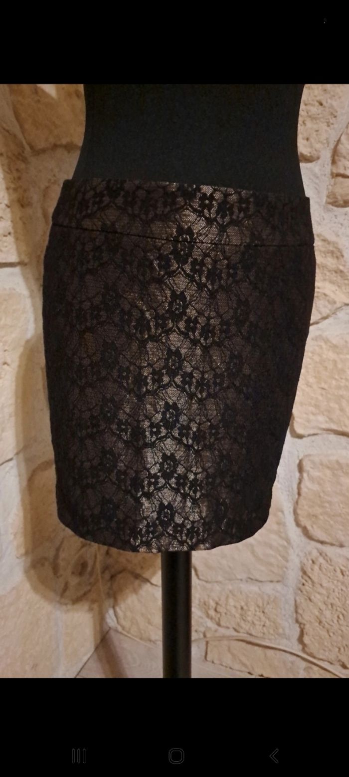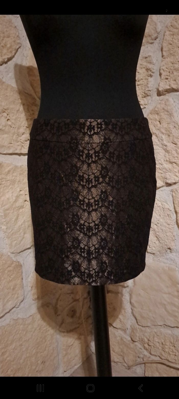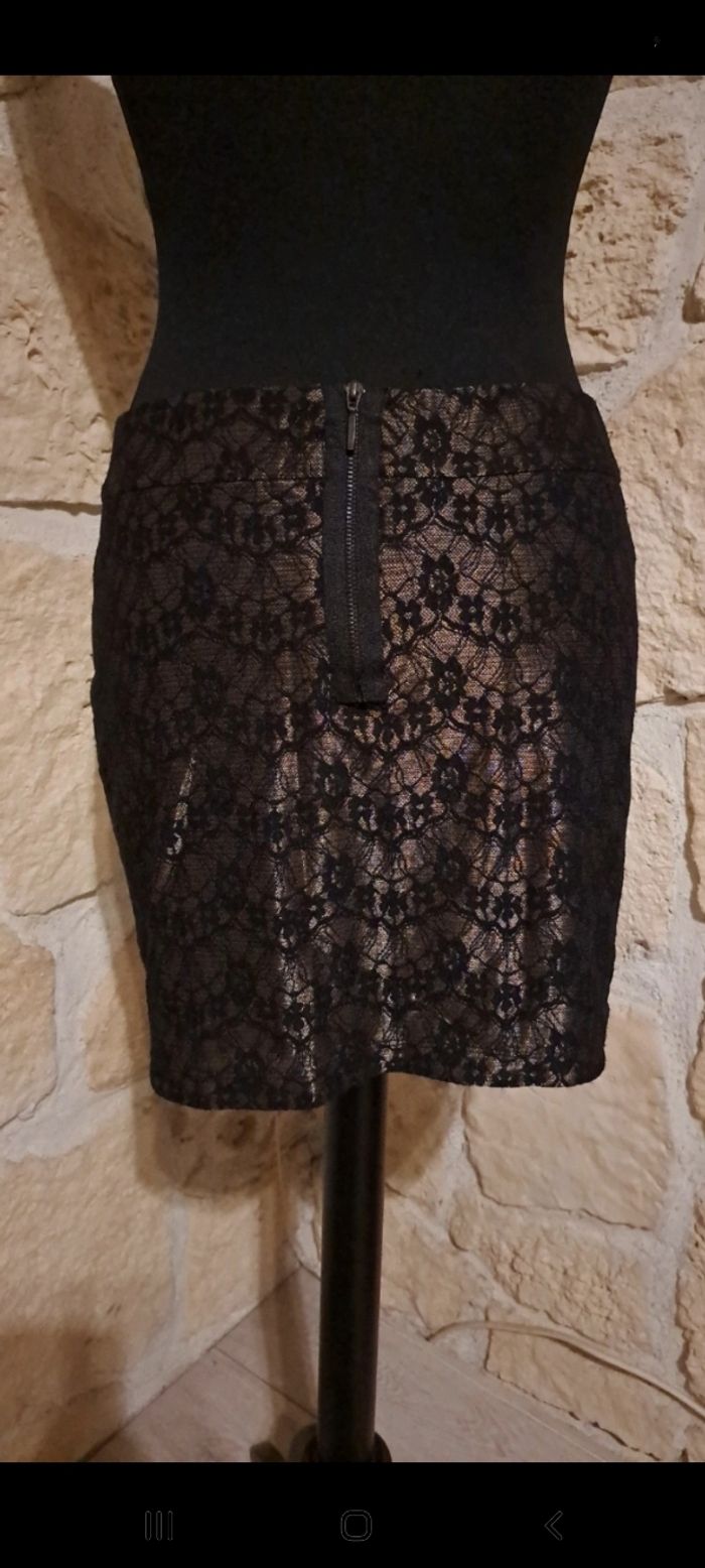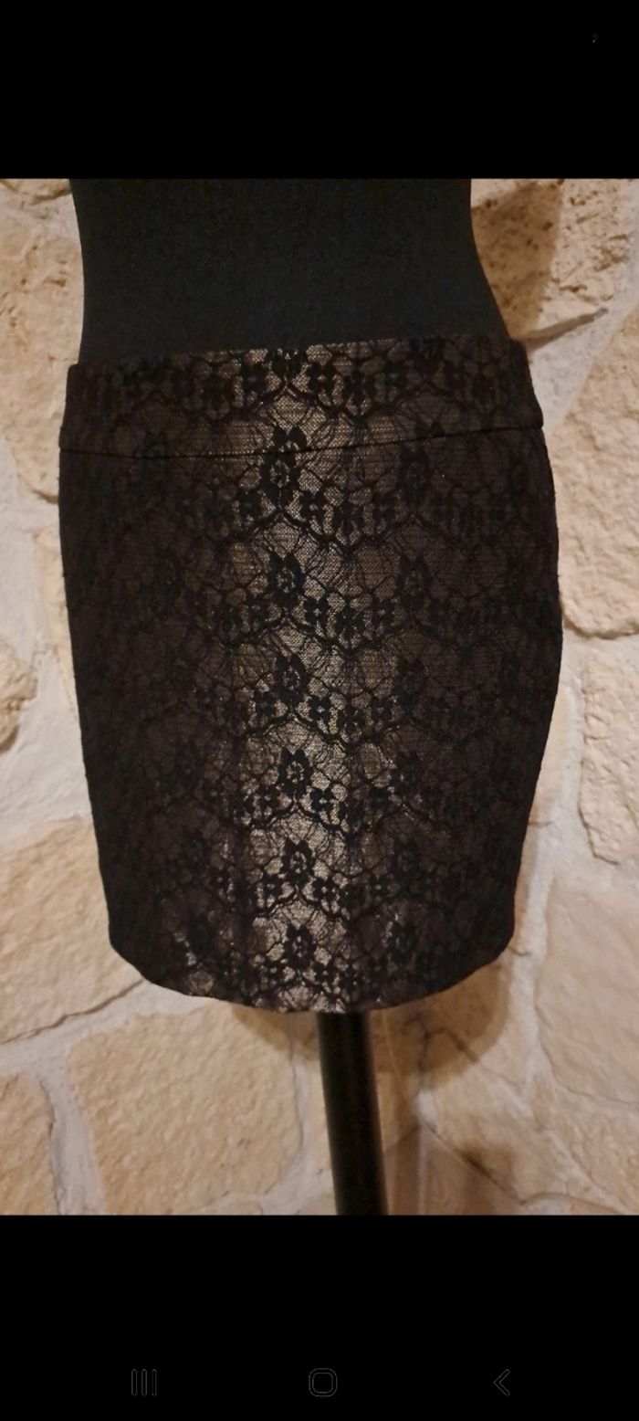 Jupe habillée Promod Étiquette taille coupée mais c'est un 34/36 Excellent état Dentelle noire sur tissu doré cuivré Jupe doublée Idéale pour les fêtes. Noël réveillon.