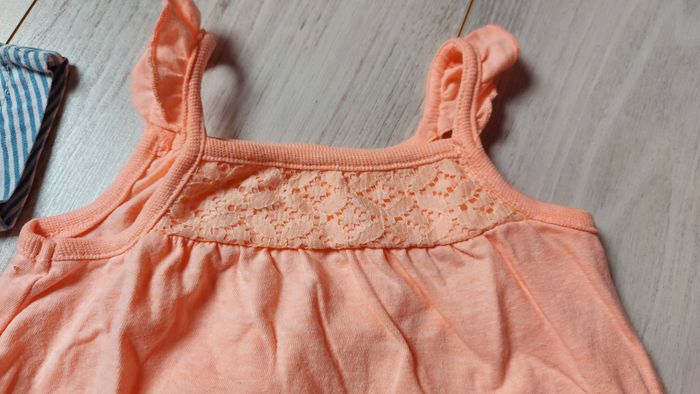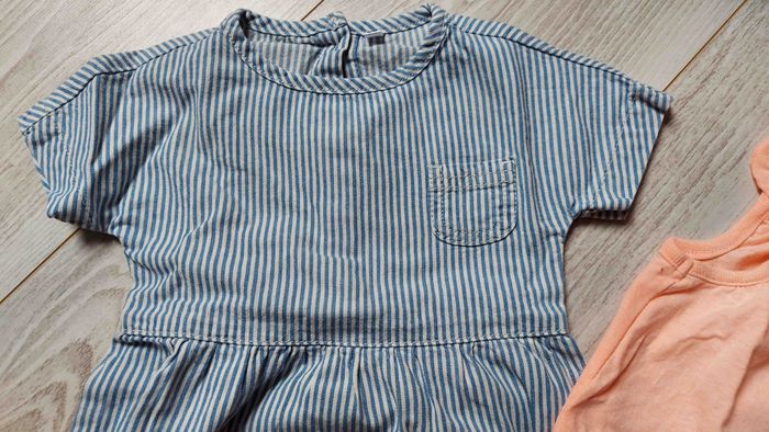 Lot comprenant Une robe bleue et blanche Taille 6mois, 68cm Une barboteuse orange Taille 6mois 68cm Le tout en très bon état Marque zeeman