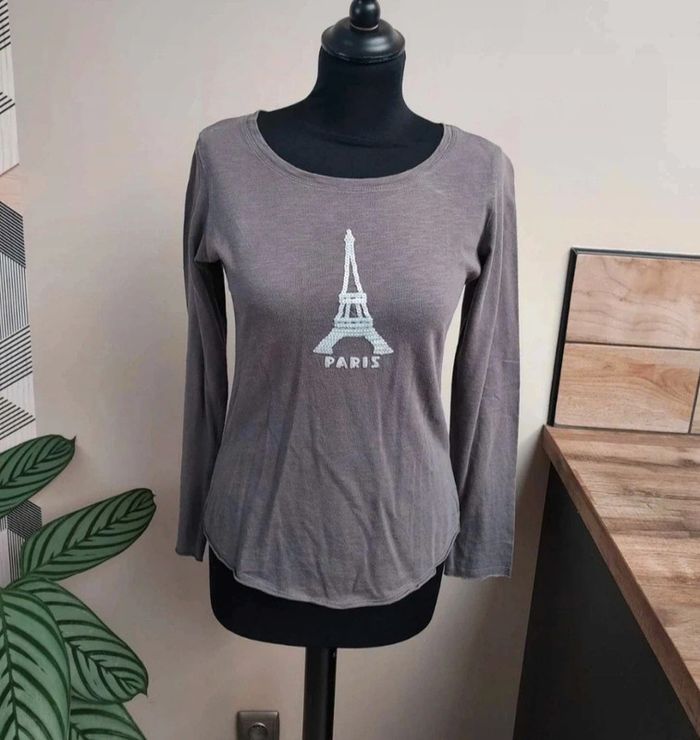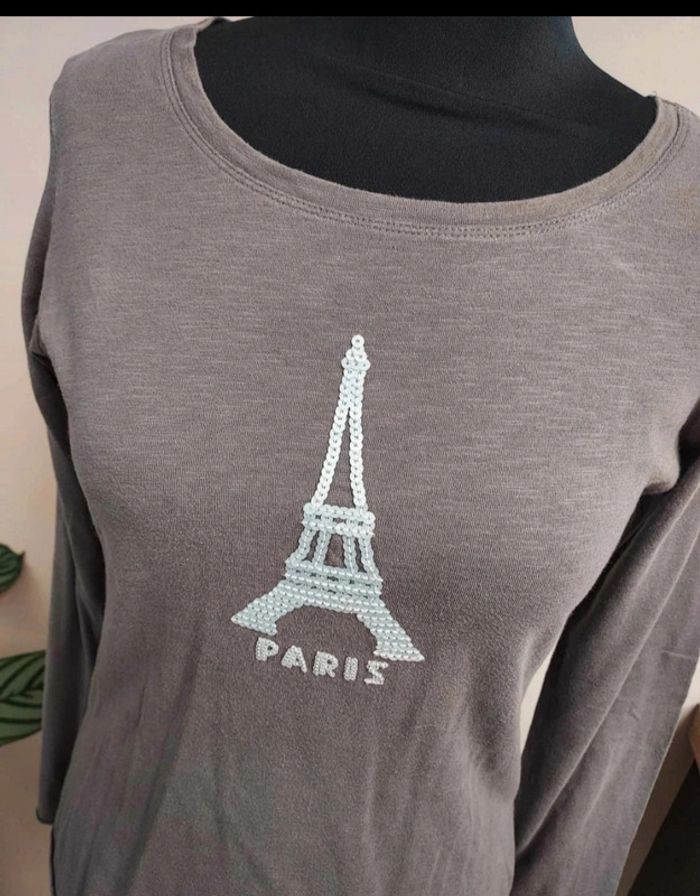 Motif tour Eiffel Paris en disques gris clair Taille 2, convient dans l'idéal pour une taille S 100% coton Réductions possibles sur lot sur demande #laféemaraboutée #teeshirtmancheslongues #toureiffel