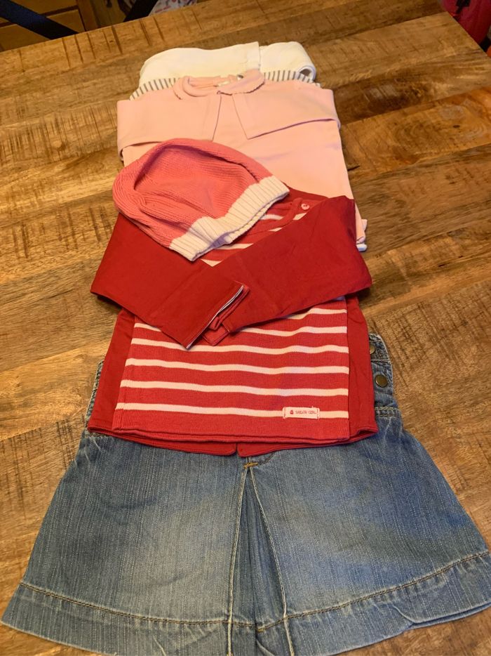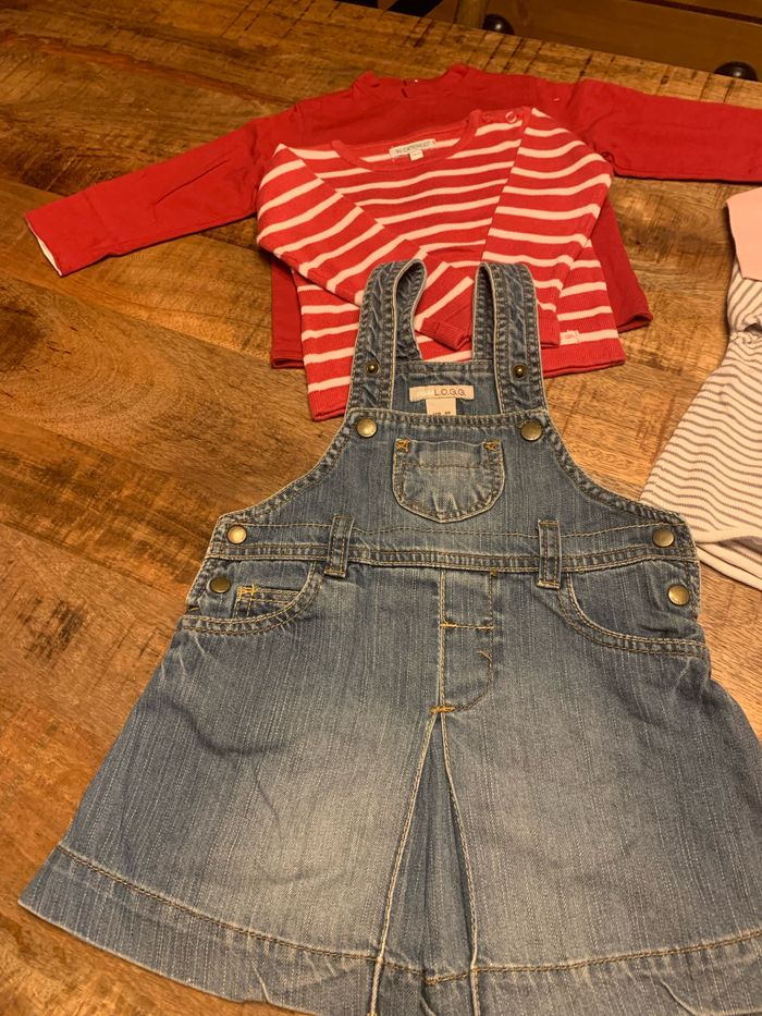 Une tenue complète (robe en jean, t shirt et pull) 2 bodies 1 bonnet 1 gilet 1 t shirt manches longues Marque : kiabi, H€M.. Le tout en très bon état