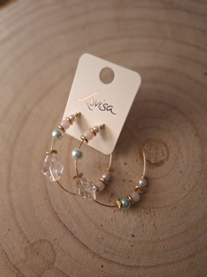 ✴️Boucles d'oreilles fantaisie avec anneau en métal doré, petites perles dorées, bleu, rose et transparente