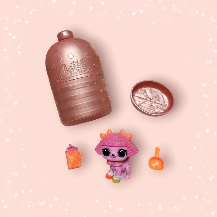 En très bon état LOL Surprise paillettes fuzzy pet, caniche pailletés queen série, avec 3 accessoires une gourde, une pelle, un panier et une belle boîte dorée 🔎 Défaut : manque les deux chaussures arrières #lolsurprisepets #lolfuzzypets