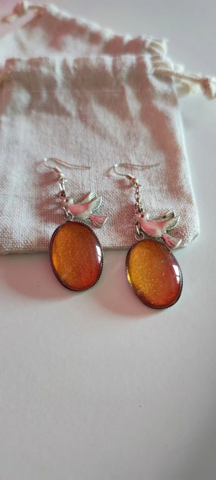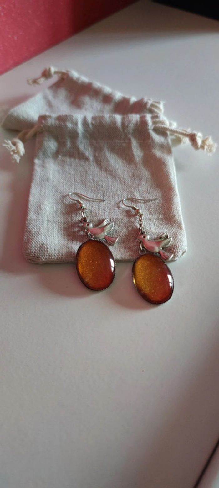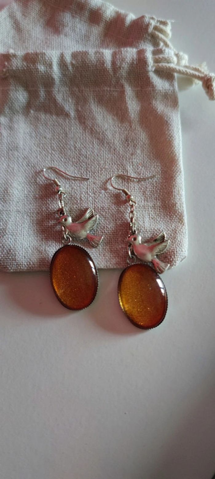 Jolie paire de boucles d'oreilles avec breloque colombe. Faite avec du vernis sous un cabochon. En très bon état 💍 Retrouvez dans mon dressing d'autres bijoux à petit prix ! Boucles d'oreilles : pendantes et puces pour faire des assortiments. Et aussi bagues et bracelets !